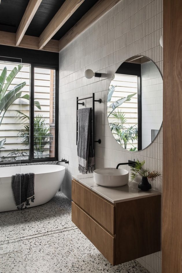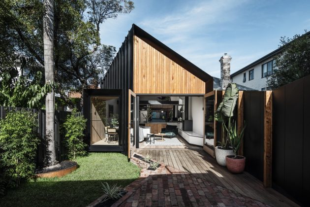 The fold in the rear elevation negotiates the close proximity of the neighboring tree canopy which creates a dynamic experience to the rear facade with the building changing appearance and proportion from different vantage points. The use of black standing seam metal cladding provides a strong contrast to the existing weatherboard house further highlighting the evolution from old to new.