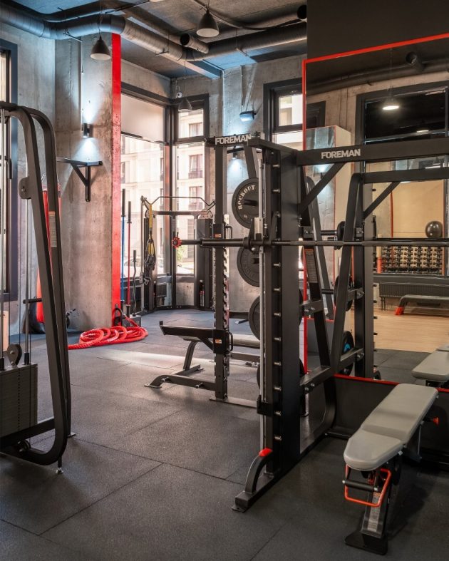 A commercial project, it was necessary to do everything quickly and inexpensively. The total area of the premises is 200 square meters. We increased the mezzanine – 40% of the area by standards, thereby increasing the total area. Due to this, two levels were obtained, not high, but their location does not interfere with the functioning of the room. In this room we organized a gym, a coffee zone, two changing rooms – a male and a female, two bathrooms, a relaxation area for regular customers and trainers, as well as a massage room.