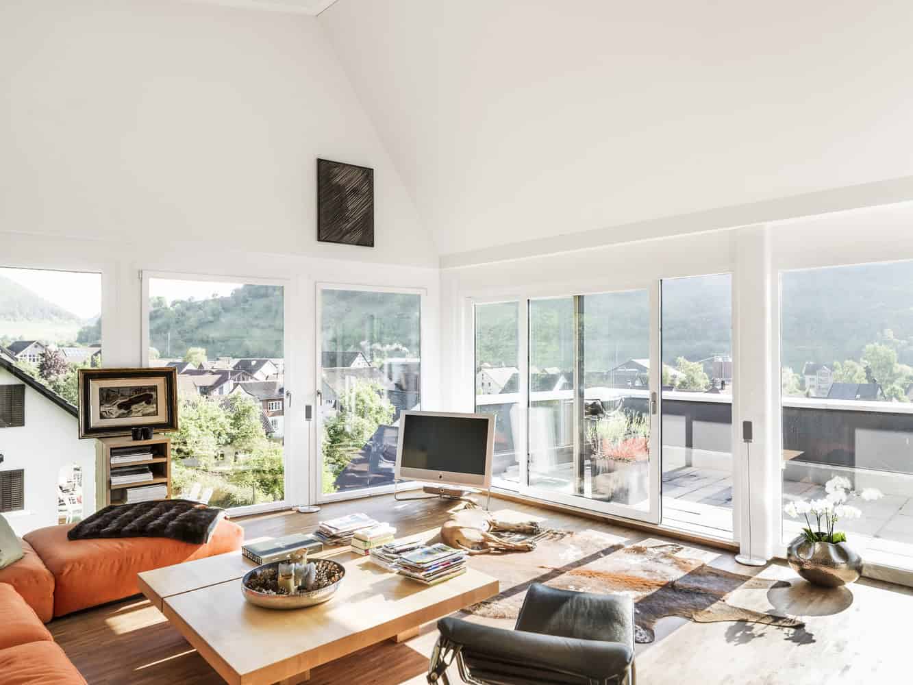 An introvert north facade contrasts strongly with the other facades, which are symmetrical and open to the views. The windows on the south, east and west façade are carefully designed and positioned in a dialogue with the slope.