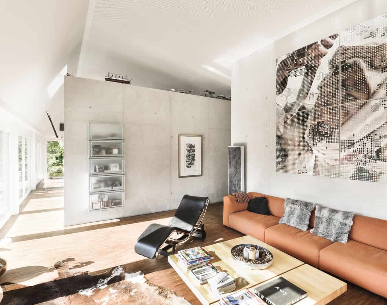 As for the interior, the program is split vertically: the public area is on the first floor and the private area on the ground floor. The use of natural and rough materials, such as concrete and wood, create the perfect stage to display the owners’ passion for art and valuable furniture.