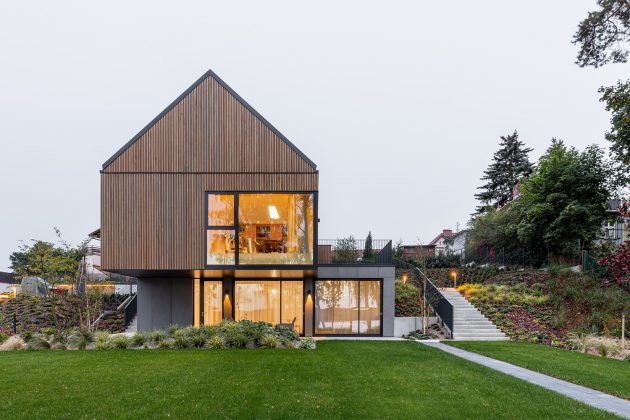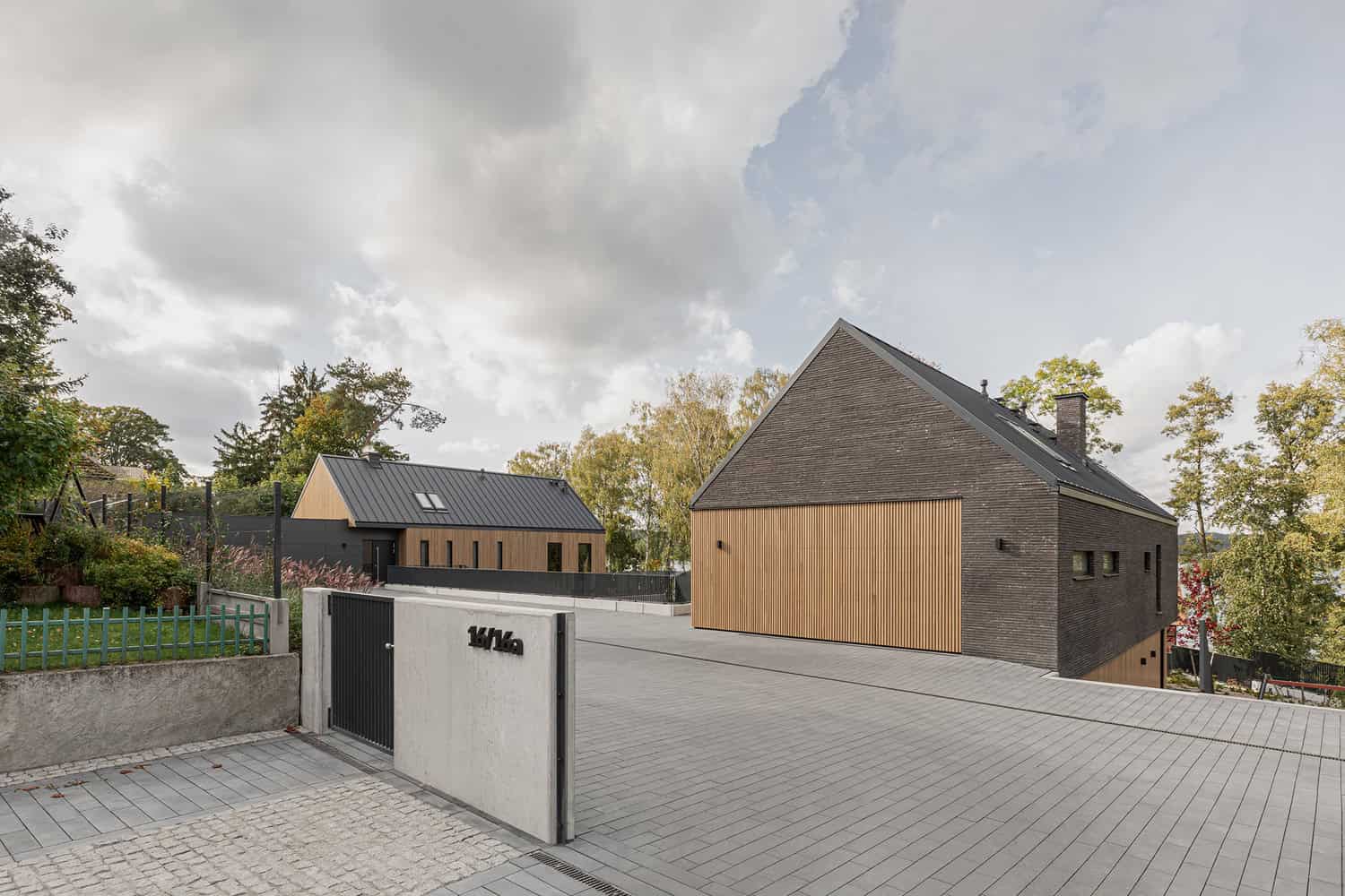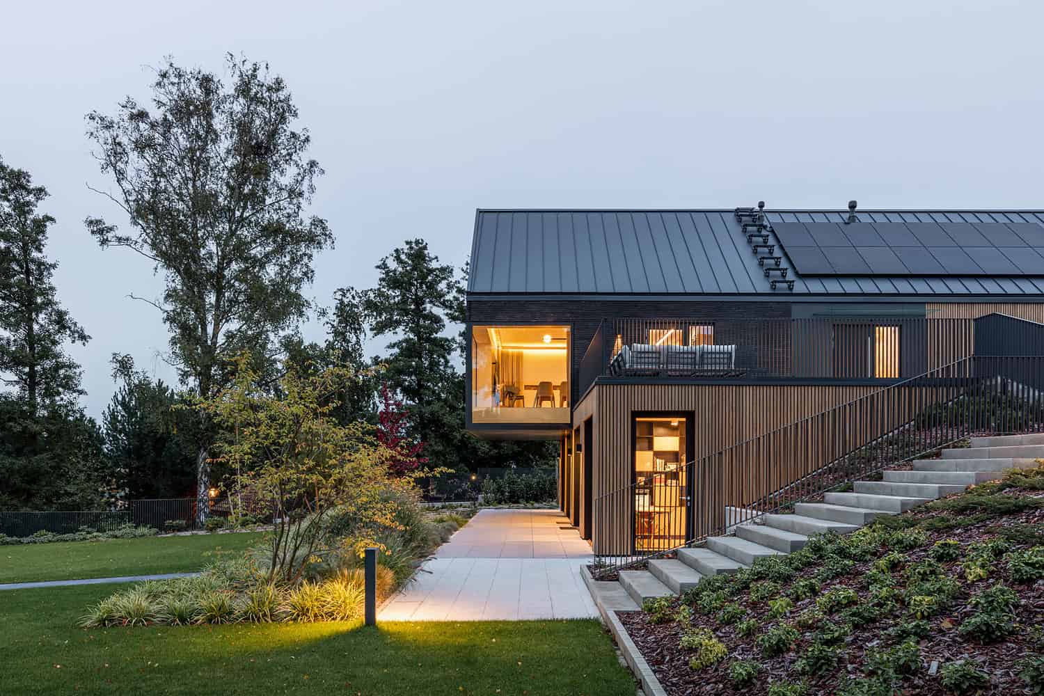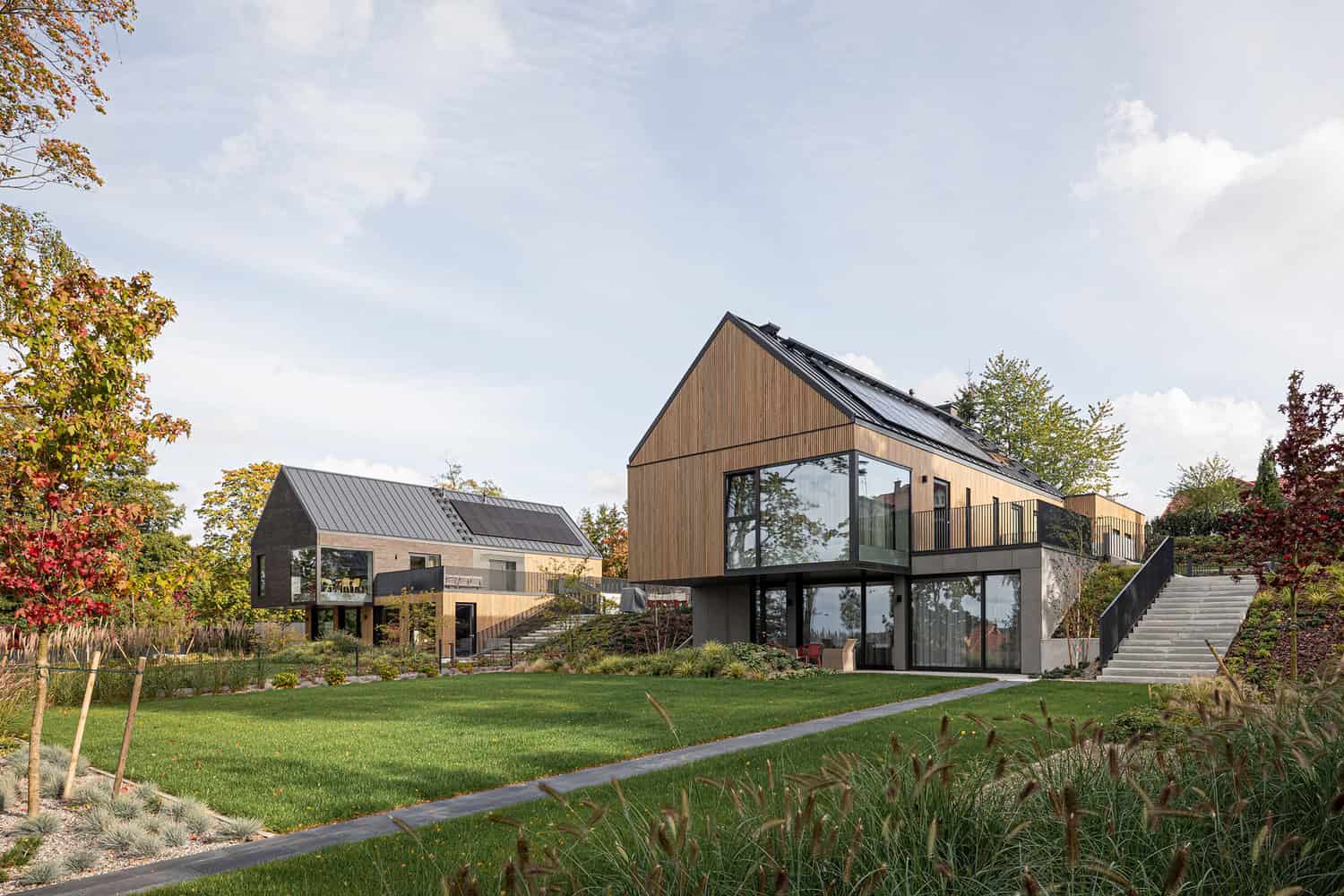 A steep slope of the plot separates the private part of the gardens from the street, creating a calm green zone overlooking the lake. By using natural, noble materials such as wood, stone or brick, the buildings blend in with the surroundings and complement it.