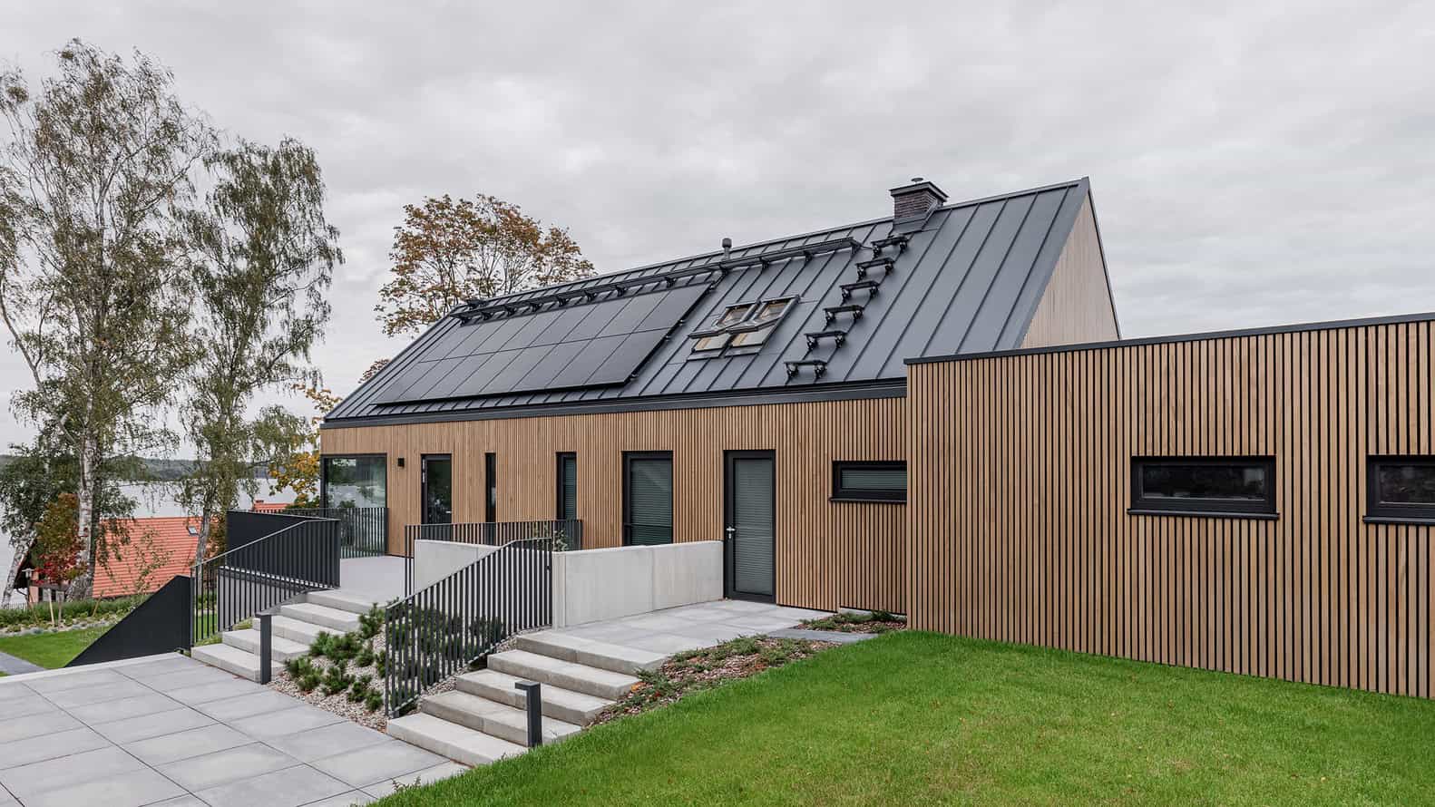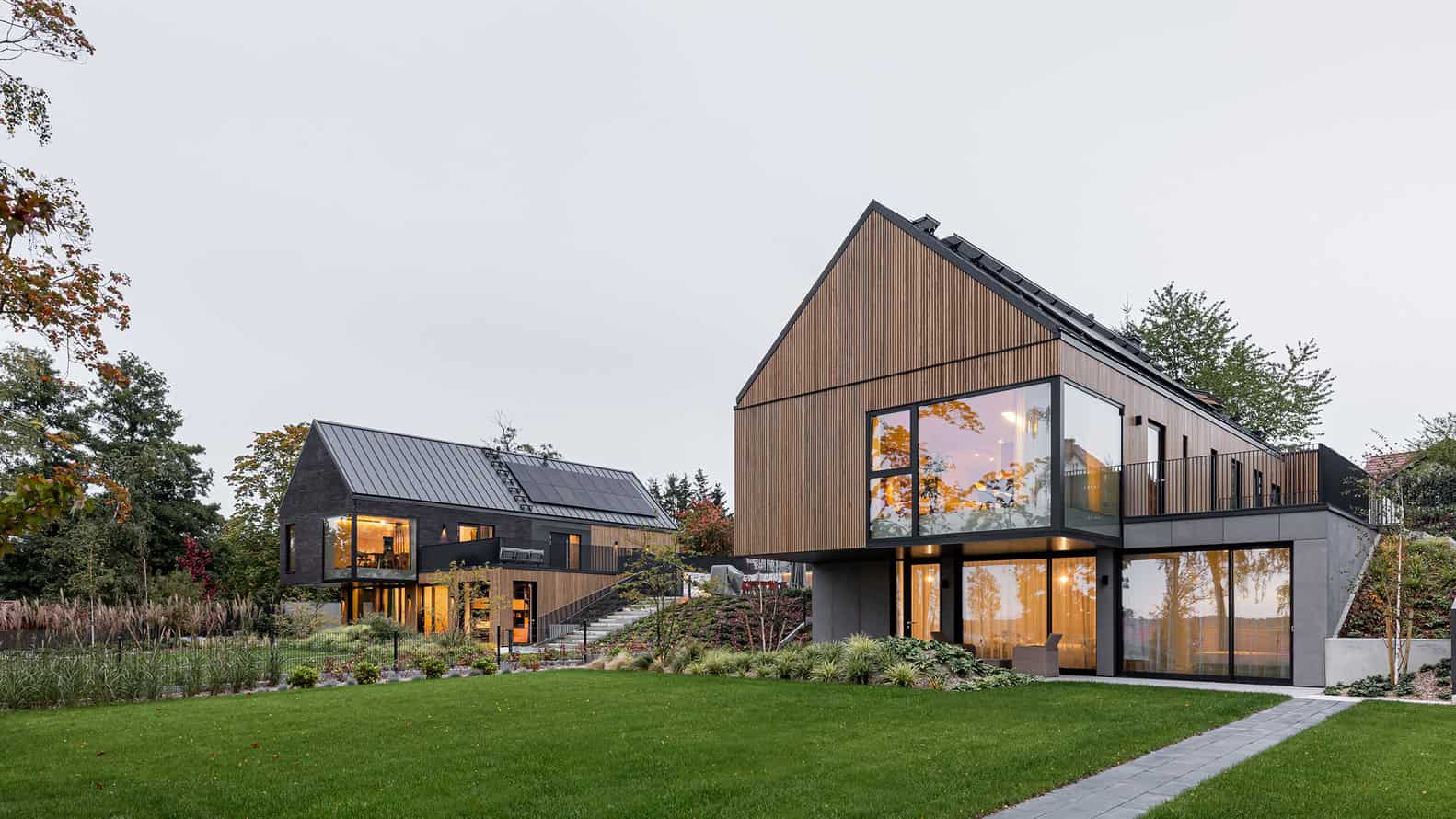 Complex of two single-family houses situated on the shoreline of the lake. A plot of land with a south entrance and steep slope was a design challenge.