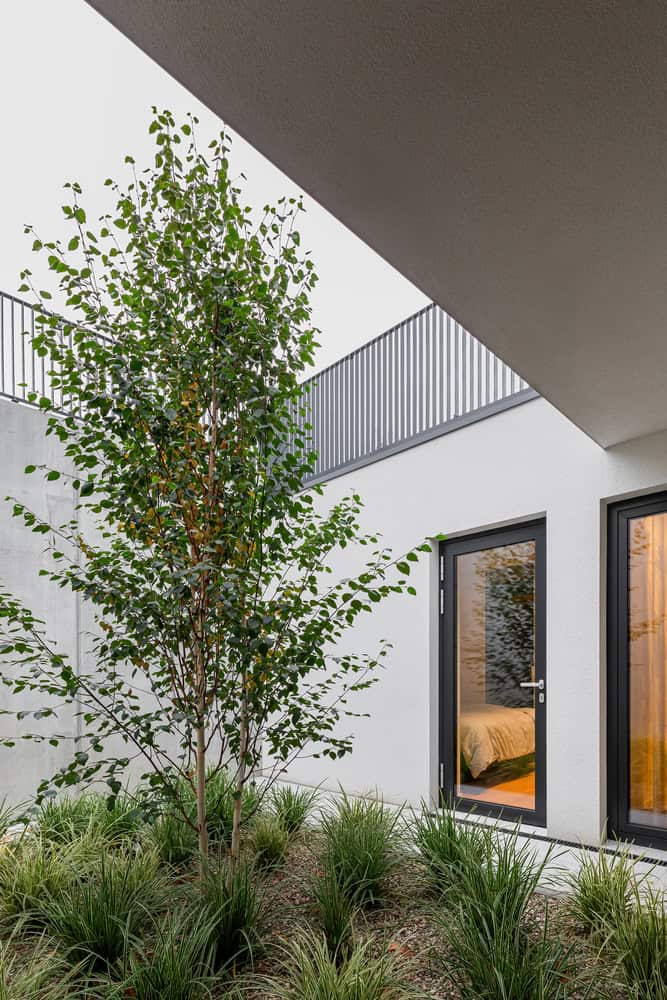 The concept is to reverse the night and day zones. The night zone is on floor -1, while the day zone is available on floor 0. The building uses the natural terrain – it flows down with the surroundings. Thanks to this, the living area is higher and we get a greater panorama of the lake, and the two-storey blocks of buildings, partially hidden in the slope, do not disturb the scale of the town and fit into the existing area.