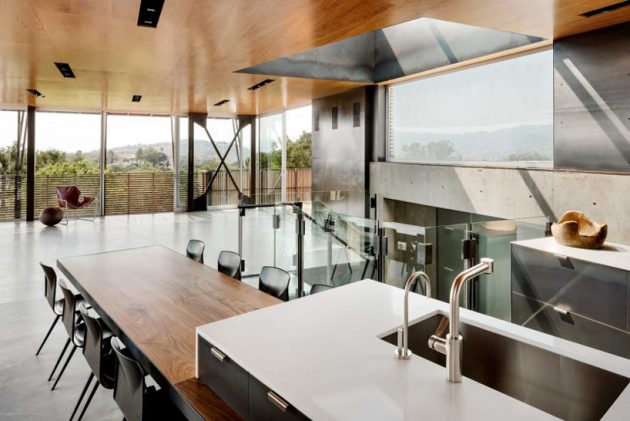 The Skyline Residence is a stunning Californian residence wrapped in Ipe wood screens and glass. It was designed by Shubin + Donaldson Architects and is located on a narrow hillside plot in Santa Barbara. The home was designed for an industrial designer and their young family. The interesting part about this residence is that the main living areas are located on the top floor, enjoying breathtaking panoramic views of the Pacific Ocean while the bedrooms are placed on the second floor and finally, the service areas are on the ground floor.