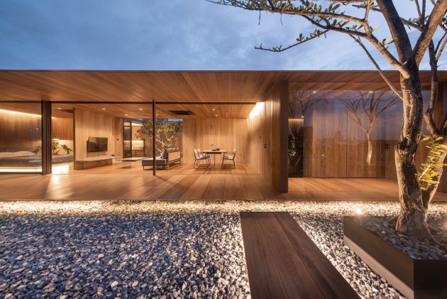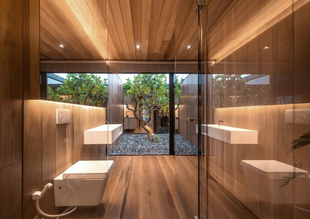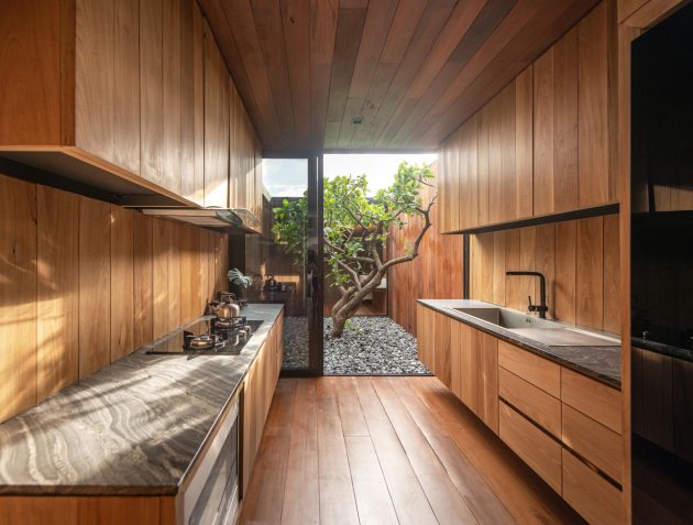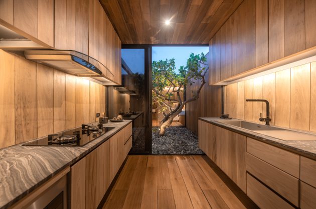 The courtyard acts as the heart of the home, a private void of light and air visible from every room, ensuring cross-ventilation and a sense of openness despite the compact footprint.
