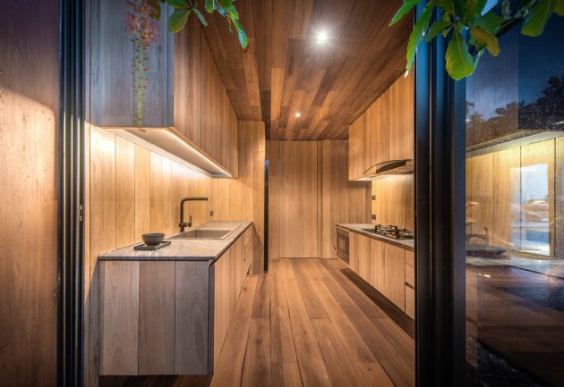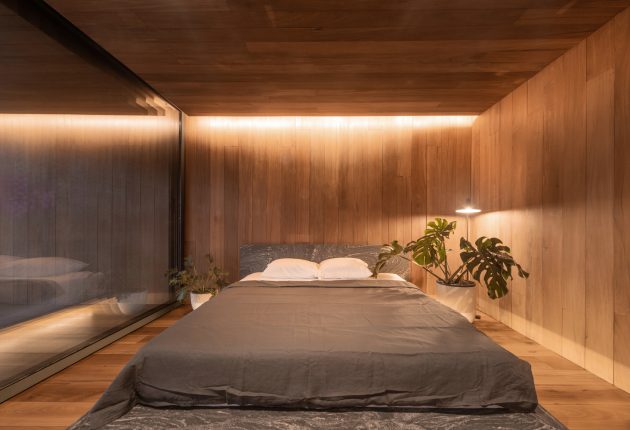 Designed for a single occupant who rarely entertains, the house follows a six-grid layout aligned with the existing apartment’s column grid.