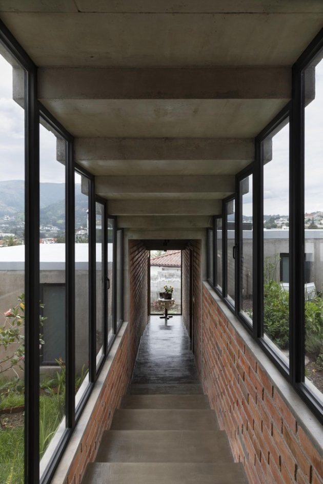 A glazed corridor-staircase connects the blocks, negotiating the slope while allowing panoramic views and access to multiple terrace levels.