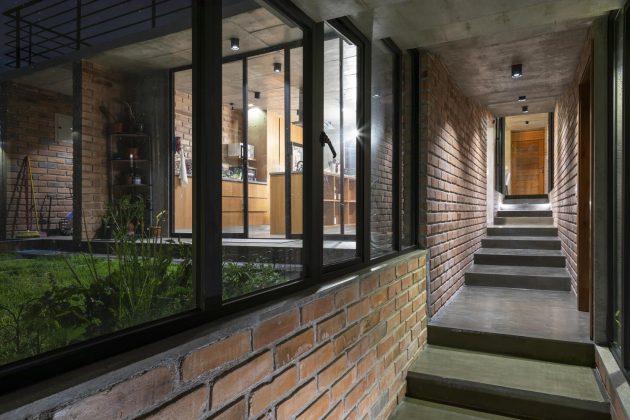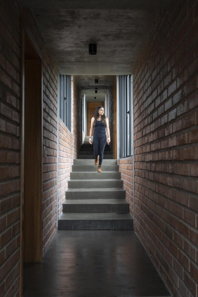 The side walls (east and west) are designed as both privacy buffers and thermal mass: cavity brick walls composed of double brick rows with a 5 cm concrete cavity. The result is a wall system that reduces slenderness, serves as formwork and functions as both exterior finish and structural element. The circulation path uses glass enclosures to make the stair-corridor light and transparent, bridging levels while maintaining connection with landscape.