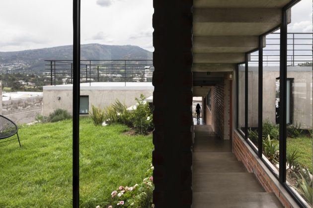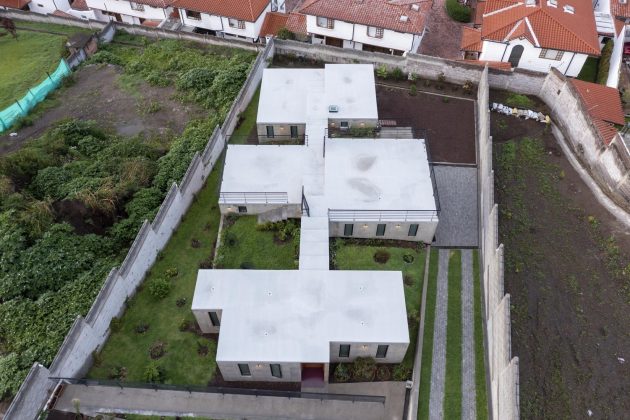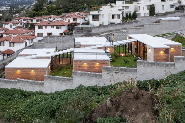 Rather than hiding the slope, the architecture uses it. Each block is elevated to align with its own garden or terrace, creating outdoor spaces at interior-level height. The staggered volumes step down the site, and walkable rooftops tie together the blocks while delivering additional outdoor surfaces and vantage points. Views toward Ilaló volcano and the valley are activated from multiple levels.