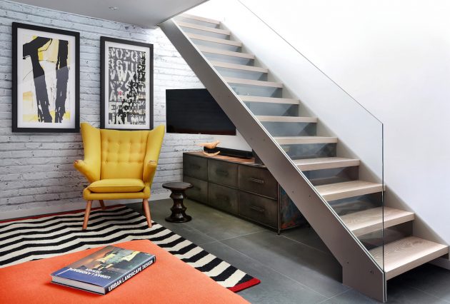 Due to its’ lack of natural daylight this floor worked extremely well as a Living / TV room. The new open timber tread, steel stringer with glass balustrade staircase was designed to sit easily within the existing building and to complement the original 1970’s spiral staircase.