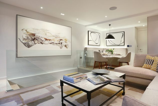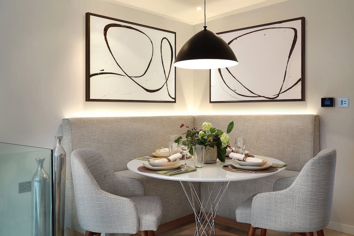 A bespoke fitted banquette was designed for the return besides the staircase, adjacent to the kitchen. This was lit from behind with LED strips, throwing a gentle light up the wall. Adding a round table, 2 dining chairs, a matt black accent pendant lamp over the table and artwork above helped to define the dining area. Although it had a small footprint the dining area can comfortably sit 6 people.