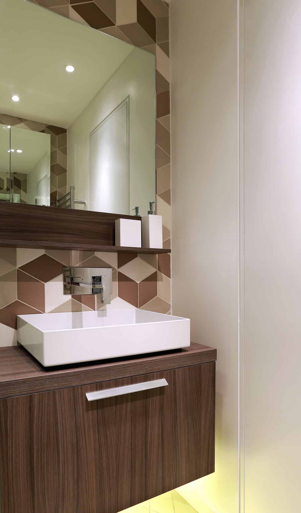 The first floor shower room was specified with a huge shower, the full width of the room, with statement diamond shaped embossed tiles in tones of cream, cappuccino and chocolate. An LED underlit wooden vanity unit and mirror finish the dramatic look.