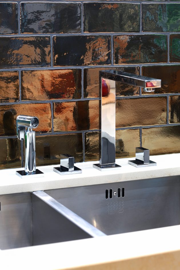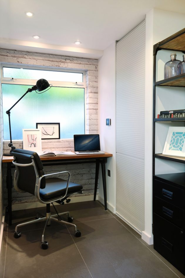 Because this space was going to be a hard working area, it was designed with a rugged semi industrial feel. Underfloor heating was installed and the floor was tiled with a large format Mutina tile in dark khaki with an embossed design. This was complemented by a distressed painted brick effect wallpaper on the back wall which received no direct light and thus the wallpaper worked extremely well, really giving the impression of a painted brick wall.