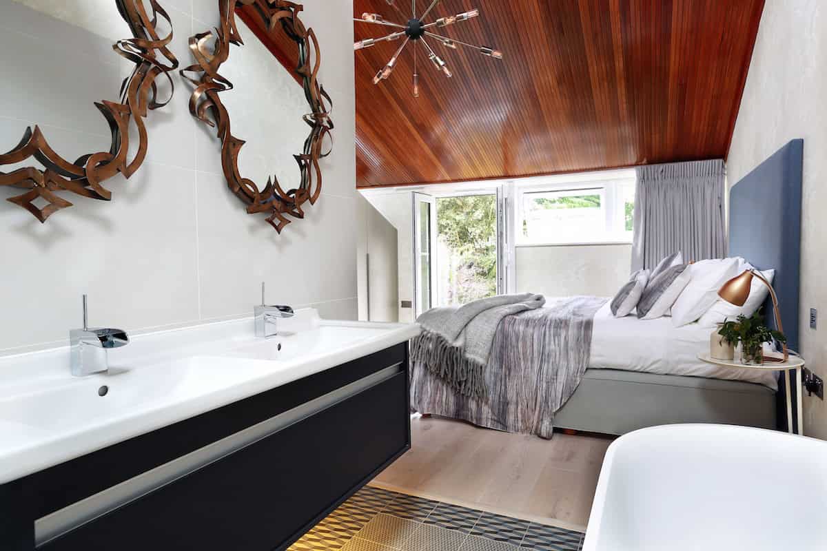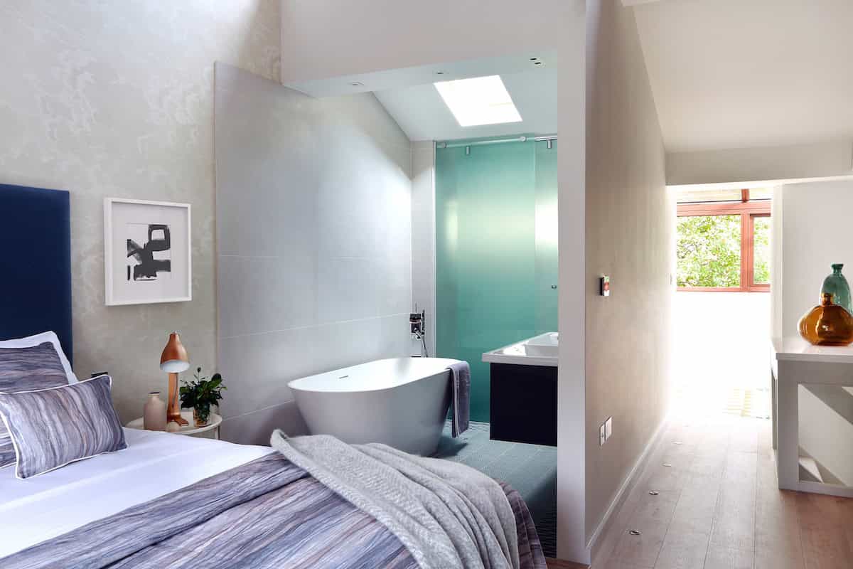 The open plan bathroom sits comfortably adjacent to the bedroom with textured porcelain wall tiles sitting easily next to the Cole & Son Fornasetti “Clouds” wallpaper. Patterned floor tiles act as a counterpoint to the to the pale timber wide plank flooring. As the bathroom was open plan it was important to bring a more “bedroom” aesthetic into the bathroom rather than the other way round and this was achieved by selecting floor tiles in the bathroom that were in the format of a rug pattern as well as adding 2no. bronze mirrors over the vanity unit. A freestanding bath was positioned facing the bedroom, offering views of the garden beyond and an opaque glass sliding screen was installed between the WC and bathroom. An LED strip under the vanity unit, additional wall lights and small in-floor uplights around the bath completed the look. The bathroom area appears bigger than it is thanks to its open plan nature.