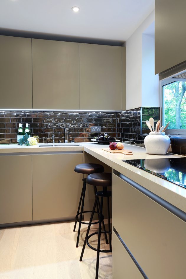 Calming hues were repeated in the kitchen, with pale khaki units and a cream composite worktop. A small breakfast bar was added and dramatic dark bronze tiles created a backsplash between the top of the counter and the bottom of the units.