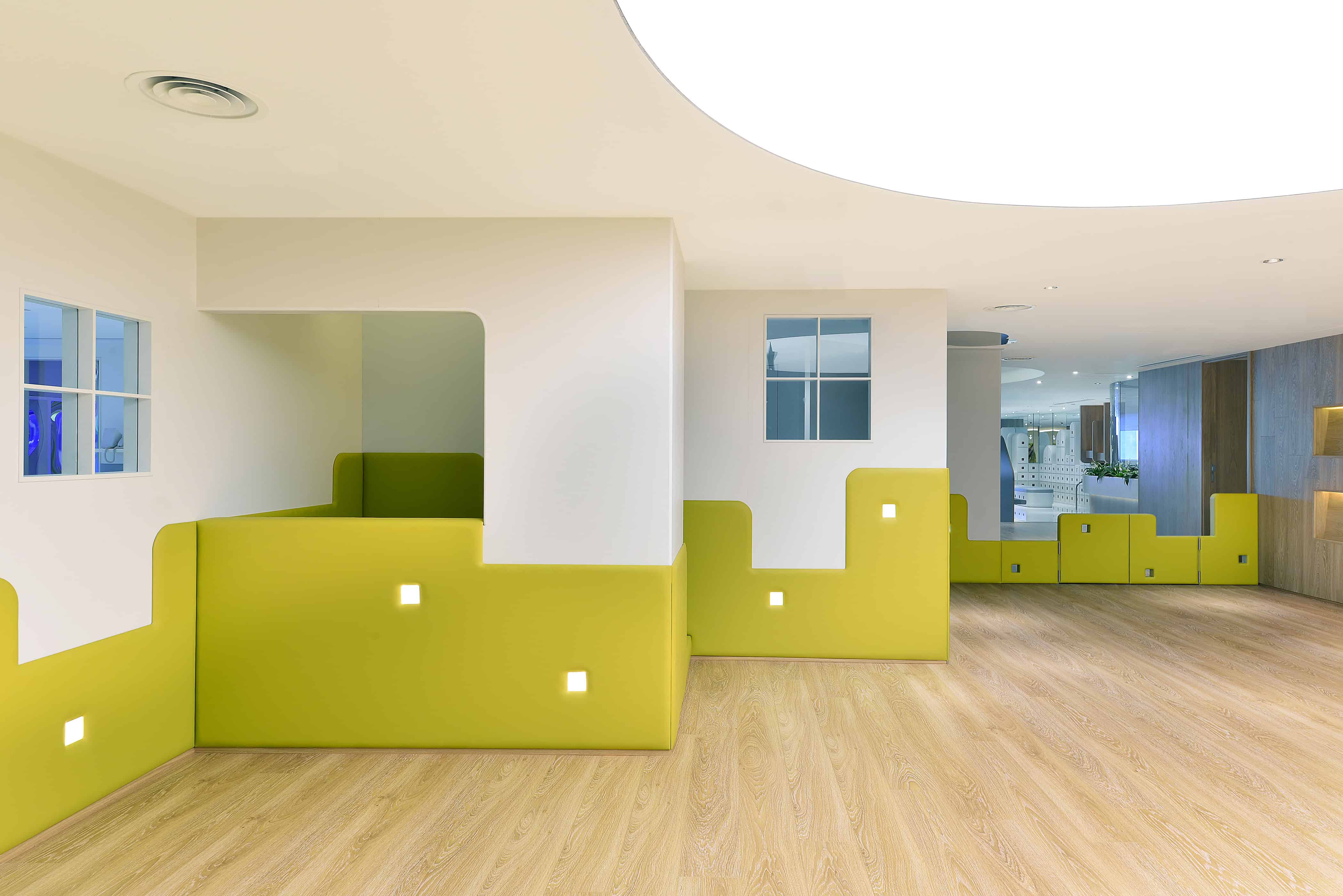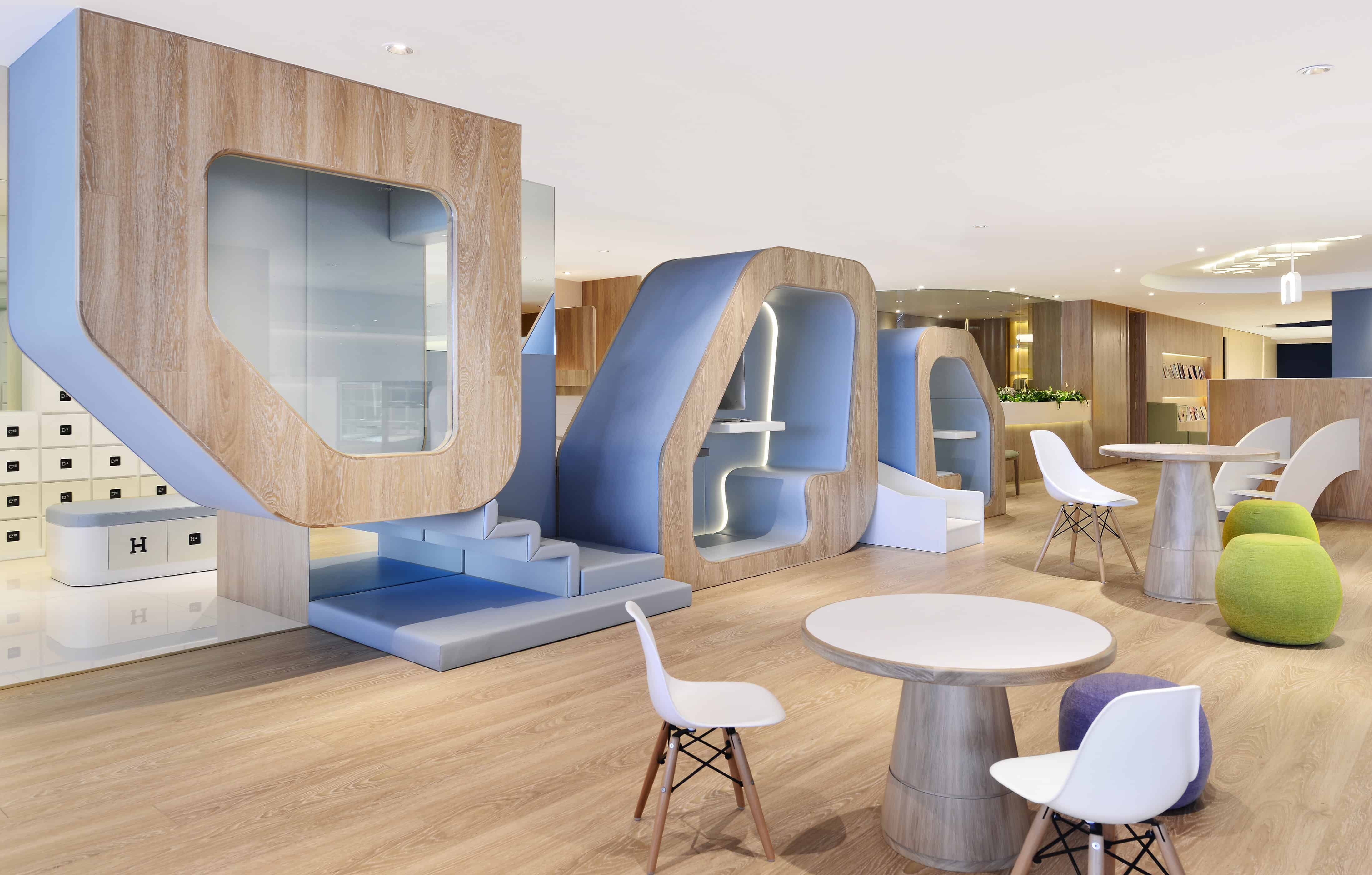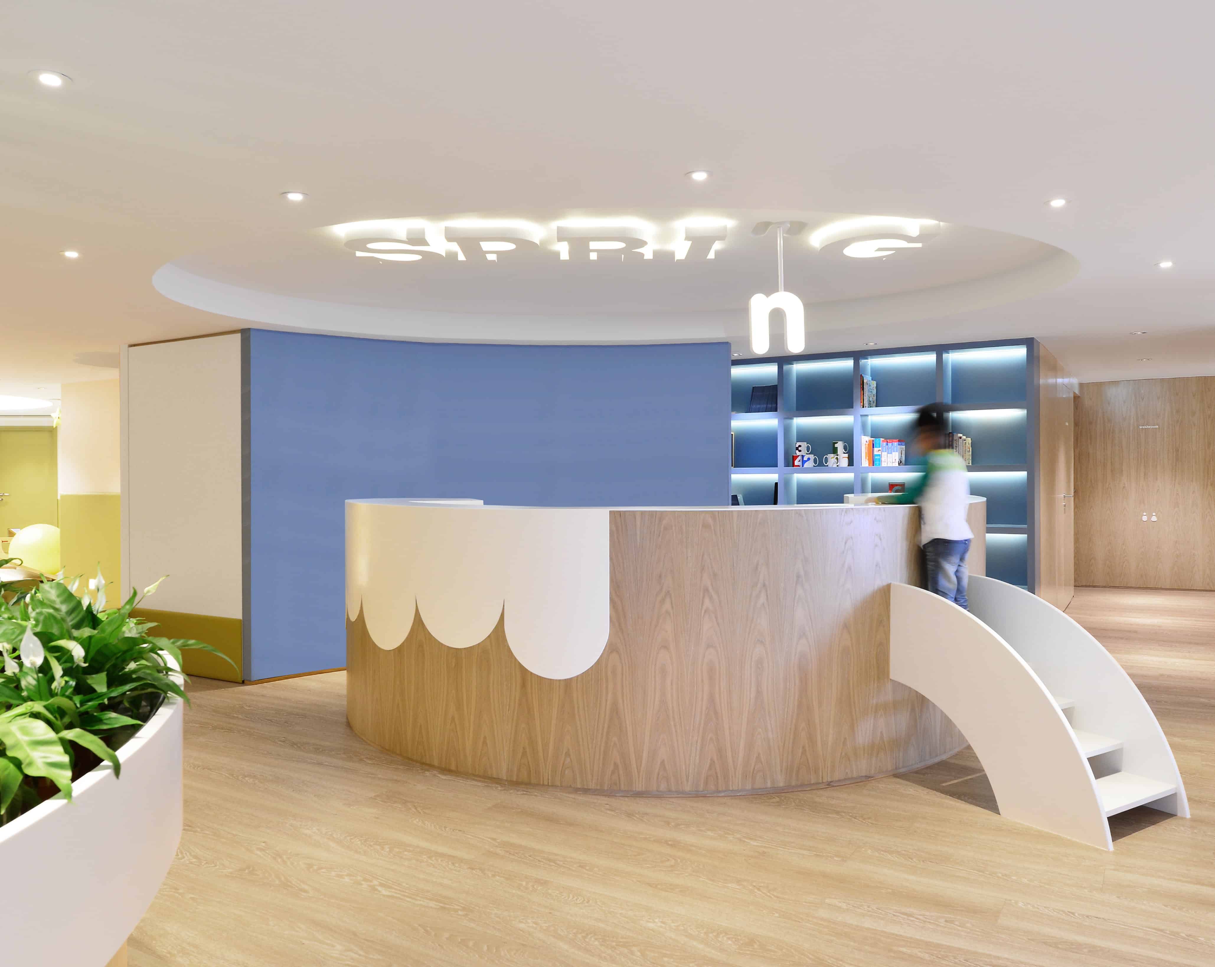 Spring is a newly established learning center for children with the aim to help them achieve their development and learning potential during the crucial growth years. With this philosophy in mind, the designer came up with a concept that would enrich the learning experience — dual perspective. By bringing together the perspectives of a child and an adult, and manifested in the space, furniture and details, it is hoped to facilitate a dialogue and interaction between the children, parents and educators. Throughout the centre, fairy tale-like cliches gave way to a neutral palette of white, light green, pastel blue and wood, with a few touches that bring back happy childhood memories. The tree houses and swings in the cafe are inspired by the outside greenery, and a hilly relief feature create cozy cocoons for reading or internet surfing.