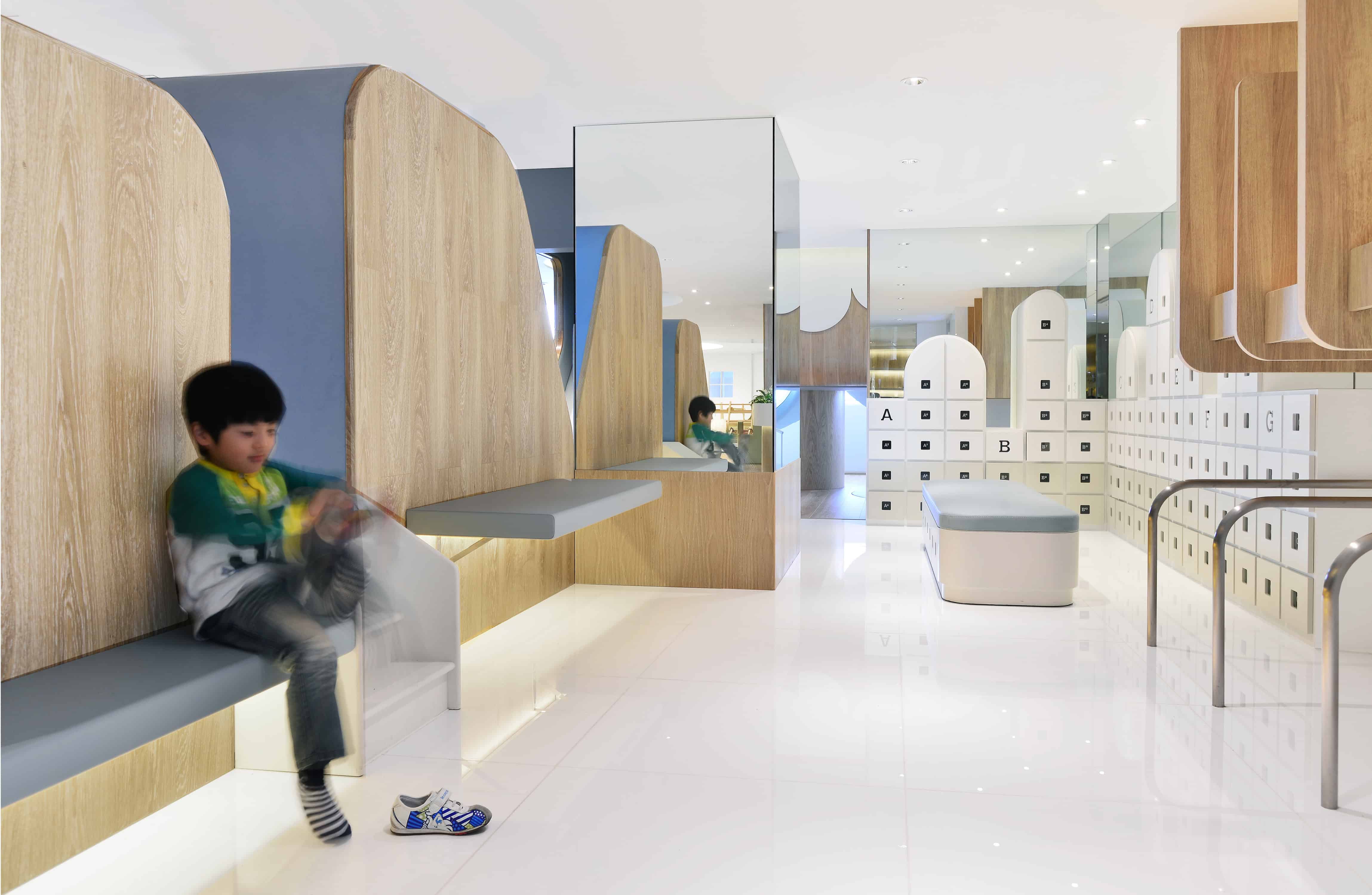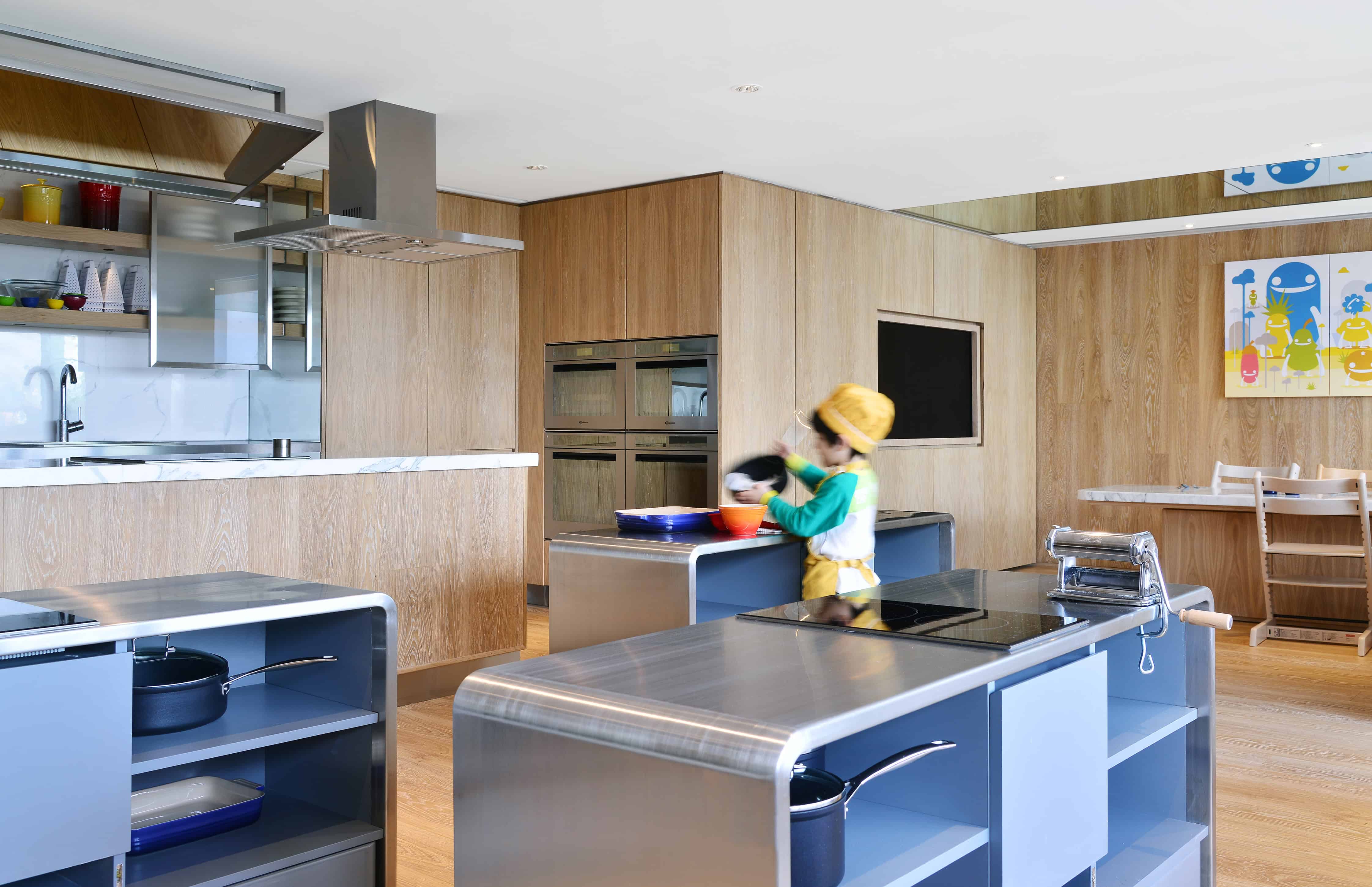 Two furniture systems catering to children and adults respectively have been designed and placed together in the various functional spaces. For example, the reception counter is fitted with stairs to allow kids to climb up and communicate with the staff directly. The cooking studio is modeled after a professional kitchen, equipped with stainless steel worktops and kitchen equipment which are reduced to child dimensions to give about an authentic cooking experience. Likewise, the bathroom features a dual height washbasin in the form of a fountain, which lets adults and children share the same facility and thereby forging a closer relationship.