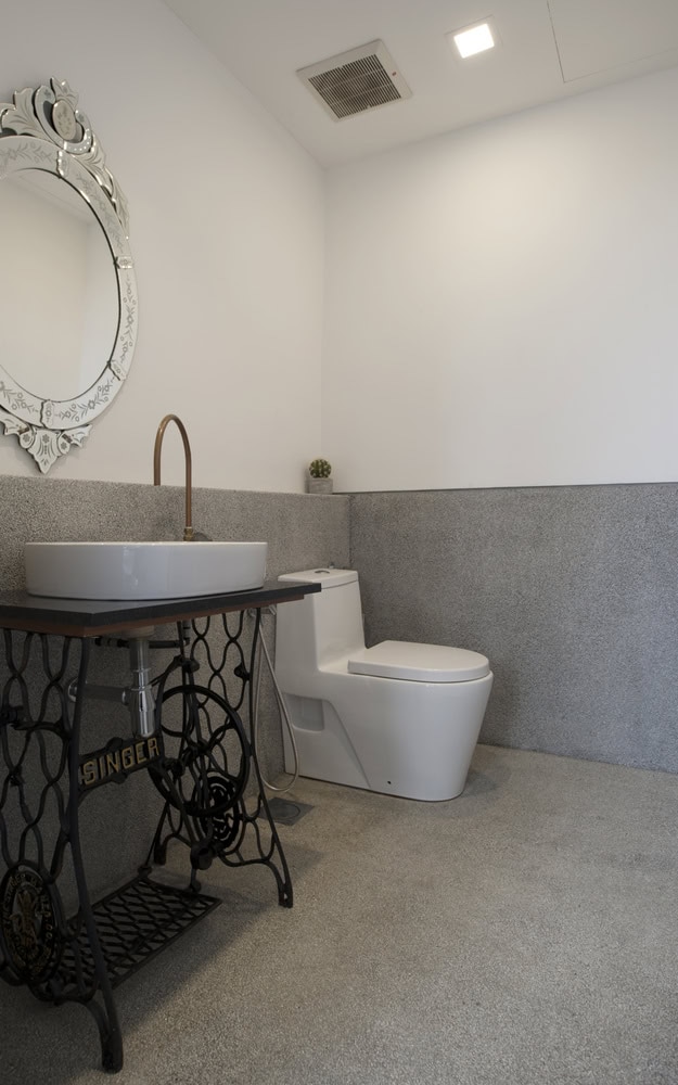 “The built-ins were all custom designed by us. We had some industrial quirks on them like the steel framed structure for the kitchen island and cement board panelling (and secret doors) at the dry kitchen. The master wardrobe and ground floor study had steel frame construction with shelving. The clients also sourced some retro items like the vintage sewing machine which we incorporated into the power room vanity, and precast terrazzo bathtubs, basins and pots from Bali, which we also included into the designs. These, mixed with some retro tile selections gave a very distinct, eclectic flavour to the bathrooms. We also sourced some printed cement enclaustic tiles from Singapore (Hafary tiles) which were used for effect along the terrace/ apron facing the pool.