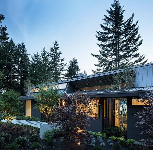 A modern house with sleek black exterior design, surrounded by lush green trees and landscaping, showcasing contemporary architecture and innovative home design in a serene natural setting.