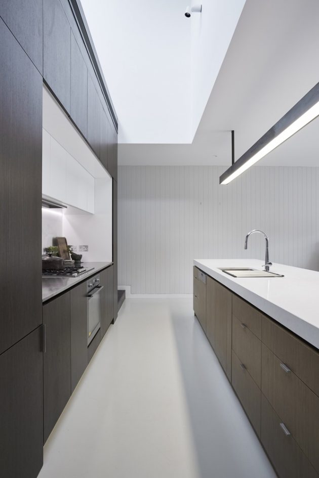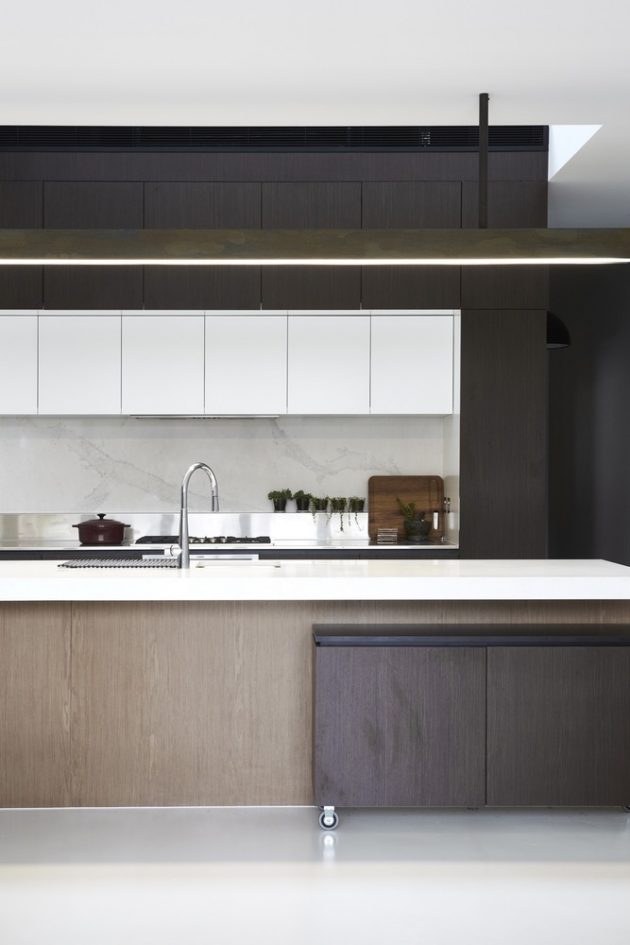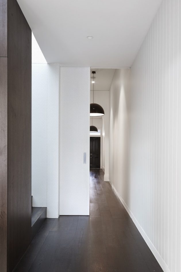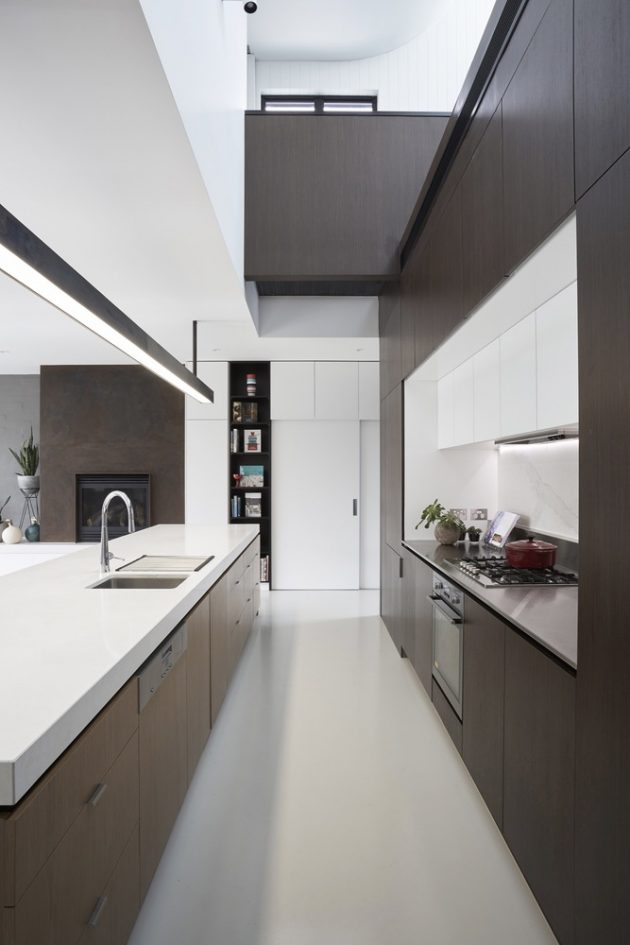“With a north facing back yard and rear street access, the house has been designed with individual zones that allow two generations to live together, permitting independence while still allowing interaction under the one roof.The union of these two different zones has been expressed through opposing elements of solidity and lightness, void and form, elevation and poise, black and white, giving the scheme a contrasting yet cohesive expression of its owners and how they’ll occupy the home.”