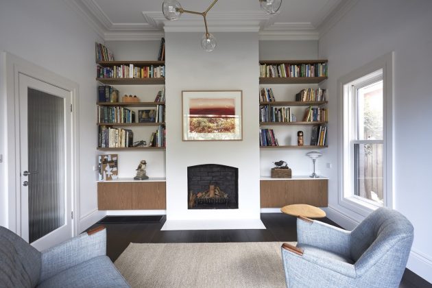 From the architects: “St Kilda East house is an alteration and addition to a semi-detached dwelling. The existing dwelling is a red clinker, double brick structure built in the early 20’s. Built as a duplex construction on a relatively small block the house has little windows to the north, blocking out a lot of natural light, while low ceilings and small rooms restrict the flow and quality of air throughout the home.The design objective was to keep the existing bones at the front part of the house, rework the internal fabric and demolish the back half of the dwelling to make way for a new open plan double storey addition at the rear.”