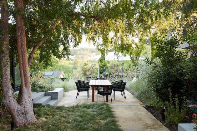 The most transformative change occurred in the backyard. A deteriorating swimming pool was removed to make way for serene outdoor living. Collaborating with Outer Space Landscape Architects, the team introduced layered patio zones, seamlessly blending into the native Californian terrain. This extended the home’s visual reach toward the surrounding hills, a view now fully appreciated through enlarged rear-facing windows.