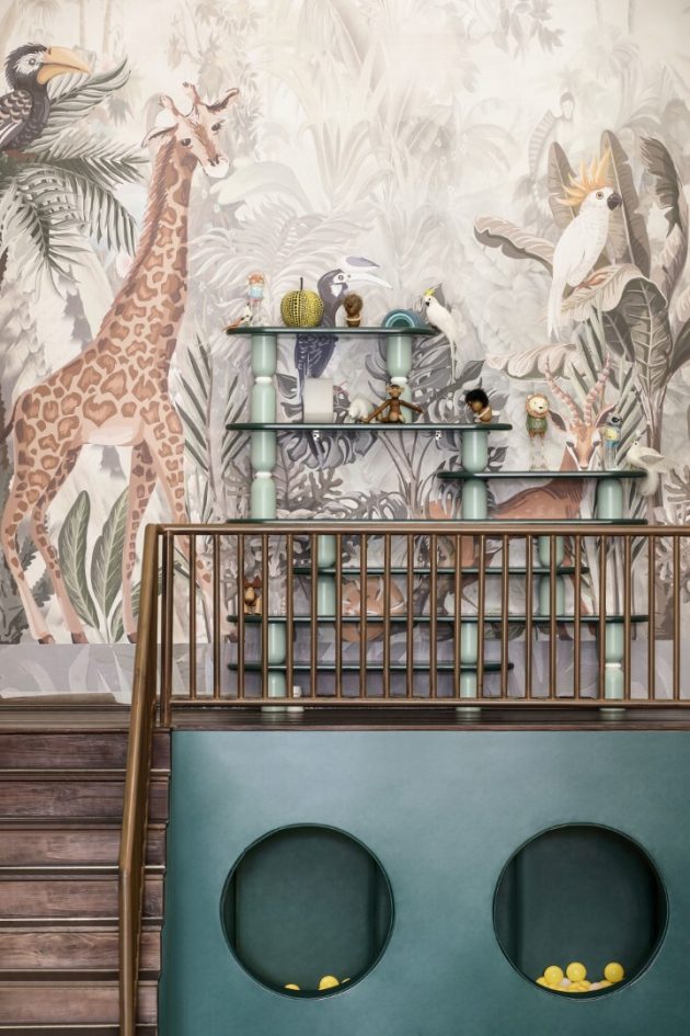 Taking “the Wizard of Oz” as the theme of the children’s area, the designers have built a green dreamland through space design and color collocation. In the space, on the one hand, the design of optical fiber and spherical light can eliminate the sense of oppression caused by the big storey height, and echo the theme of “starlight” to increase childlike interest.