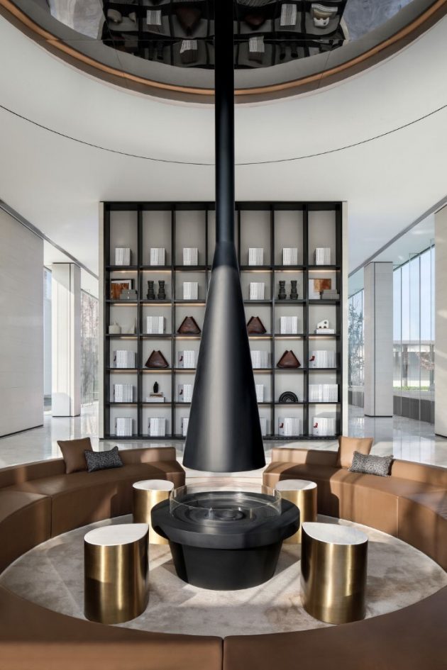 Taken from those of the land and the Yellow River, the pale brown colors in different color gradations constitute the main tone of the social space of Vanke • Starry Metropolis. The fiber-optic light passes through the ceiling and produces flares which are also “starlight”…The transparent and open building is wrapped in natural starlight, reshaping the landscape and environment, virtual or real.