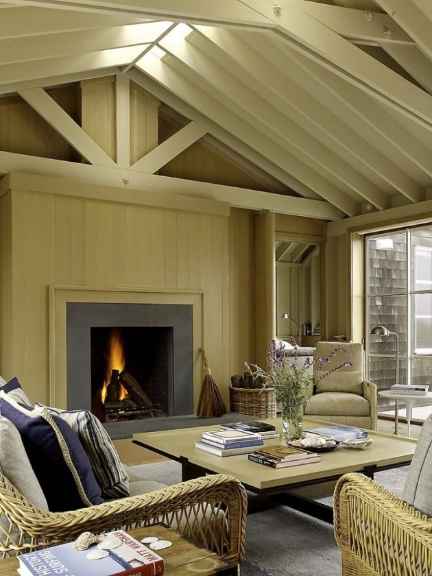 The framing of the house is left exposed to the interior, which draws on the construction techniques used in early California beach houses where temperatures do no fluctuate in the way that they do in the valleys, and of course before modern building codes. The insulation was added to the outside of the framing at both the walls and the ceiling rather than in the wall cavity itself. Vertical grain fir wainscot hides the wires and pipes below the three foot level at the walls, and is used as flooring as well. Other materials are red cedar shingles, aluminum double pane windows, bluestone used at the courtyard paving, fireplace and countertops, and Alaskan yellow cedar at the wood terrace on the ocean side of the house.