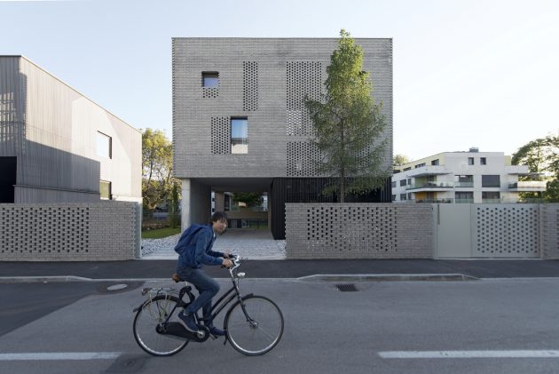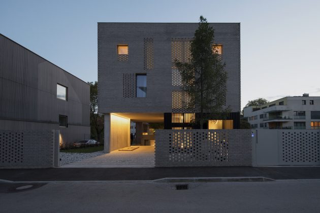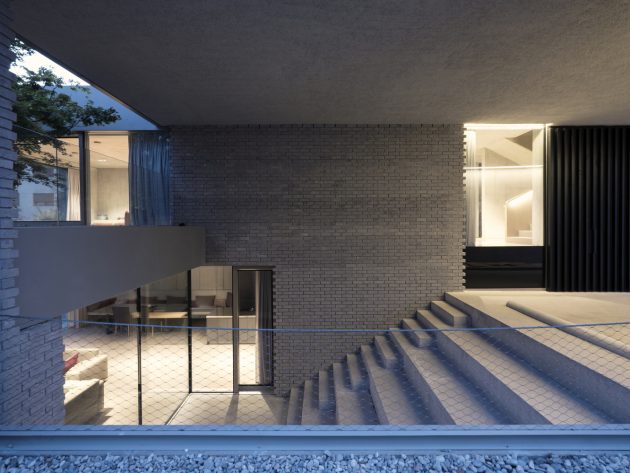 The resulting volume is wrapped in a perforated brick fabric in the exposed facades towards the street that act as a lattice and provides privacy while its back side is wide open glazed overlooking the several levels of private gardens.