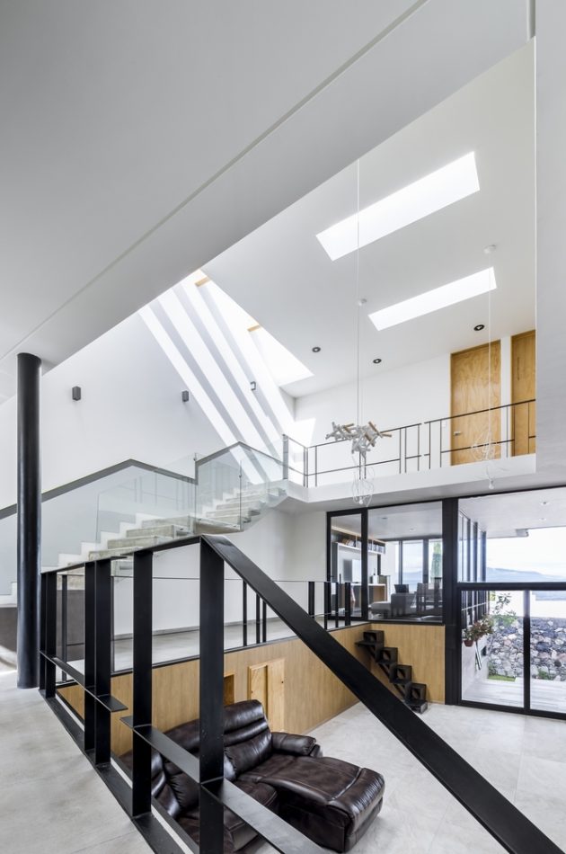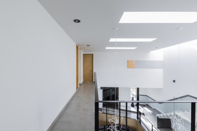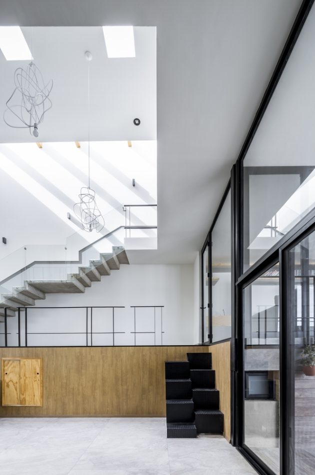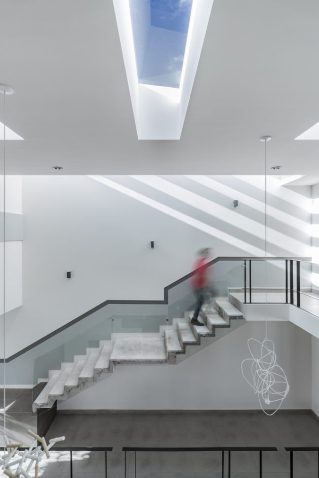 Light is treated as architecture: skylights, clerestories, double-height voids, and carefully placed openings compose a symphony of daylight that changes throughout the day. At dusk, internal lights reflect off glass and concrete, turning the house into a luminous object in the neighbourhood.