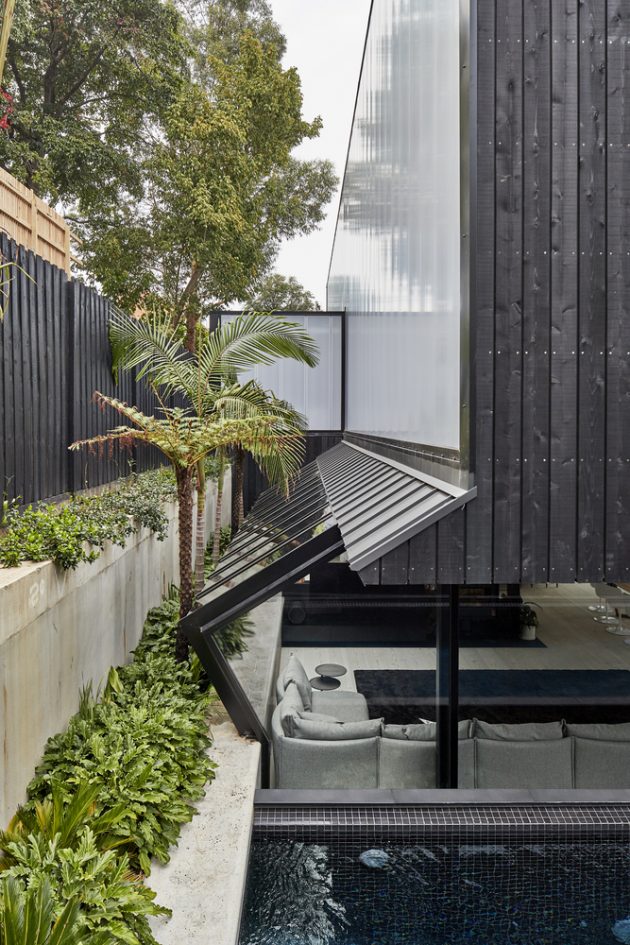 The black timber dowel screen offers privacy and fall protection and disguises what is essentially a black box. The roof form of the upper level is also legible, angled to allow the morning sun to enter in what is, on a site falling to the West, notoriously difficult to obtain.