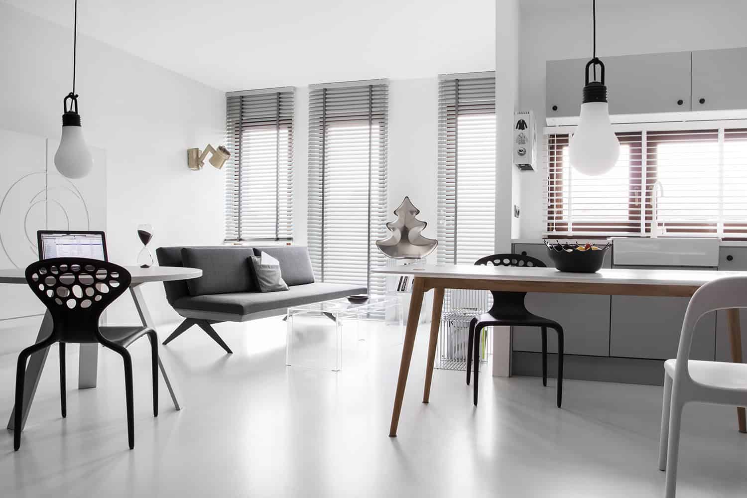 Sleek modern living room interior with minimalist design, gray sofa, black and white decor accents, and large windows with horizontal blinds, showcasing contemporary architecture and stylish home decor.