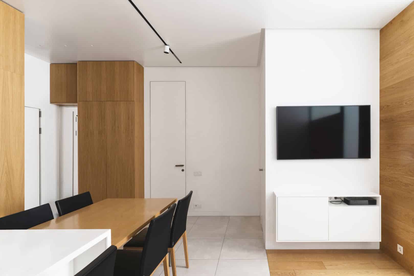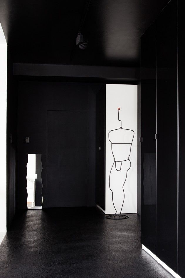 The white area is a living zone – where daily activities take place. Functions as kitchen, dining room, living room, bedroom and work space flow and interact with each other in a natural way since there are no obvious divisions – mobile lightweight multifunctional furniture and adaptable interior lighting based on busways, ease owner’s life adapting to its needs. The black part of the apartment is the communication and storage area. Colored in absolute black, wall hides the door to the bathroom and extremely capacious wardrobes.