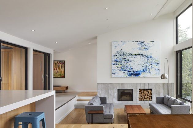 This secondary volume contains the service areas: the garage, the laundry, the storage spaces. The house is entered at the upper level, which is also the main level. The lower level contains additional bedrooms and a family room; and thanks to the slope, one can walk out from this level at grade toward the lake.