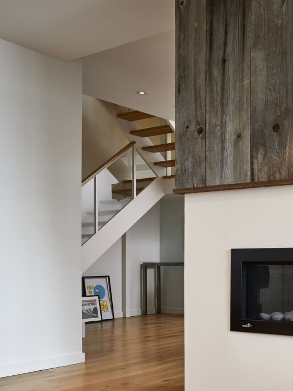 We addressed those challenges by placing the house into the slope itself. The habitable spaces are contained in a slim volume running parallel to the shore, providing lake views for every room. A secondary volume runs perpendicular, back into the hill, anchoring the house to the slope and helping to form an entry courtyard sheltered from the prevailing winds.