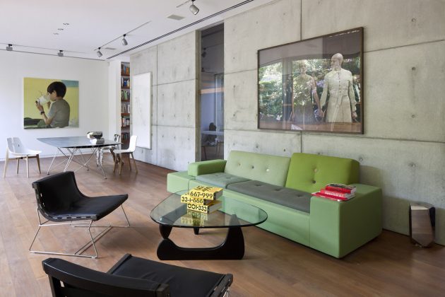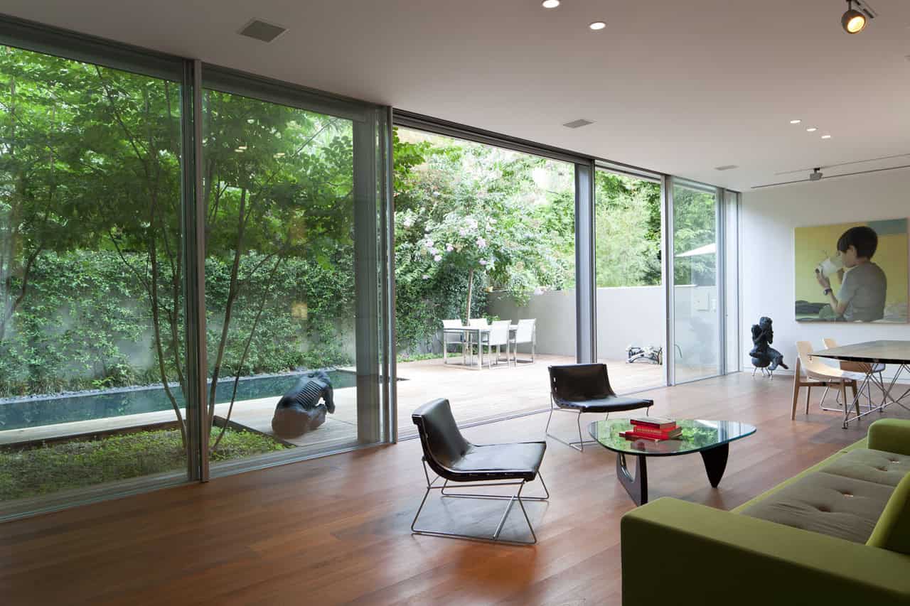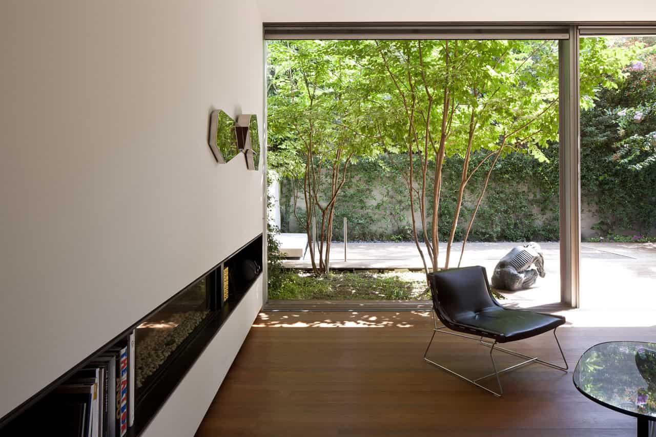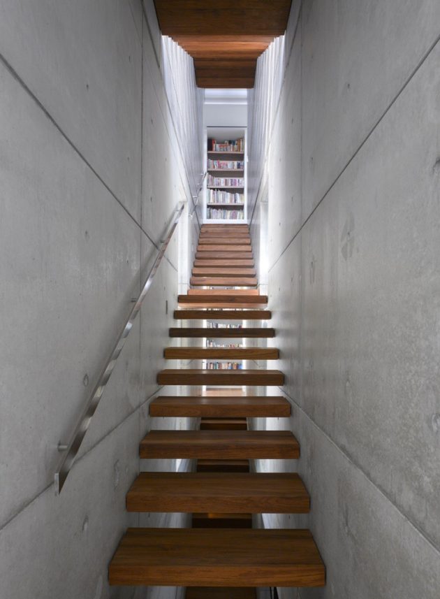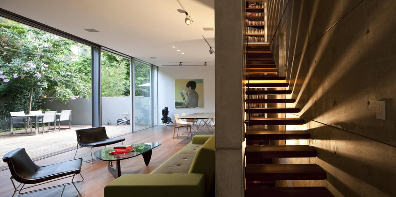 The staircase, the house’s core, is nested between two exposed-concrete walls, while the circulation wraps around the center of the house. The spaces on all floors are defined by the stairs; there is a glass gap at the landings which offers a view from the public to private spaces on the ground floor, therefore the rear garden is visible from the kitchen and family room.