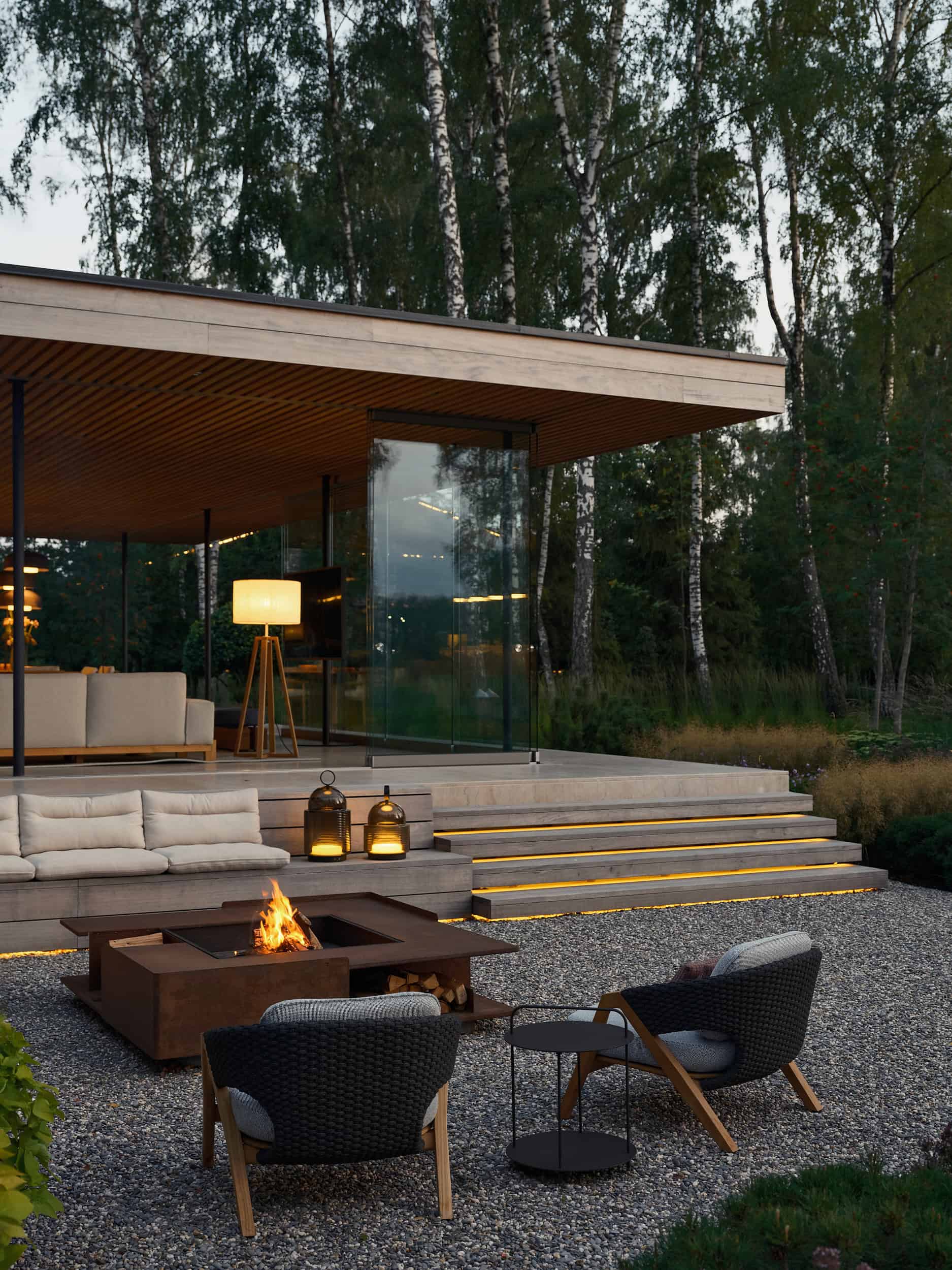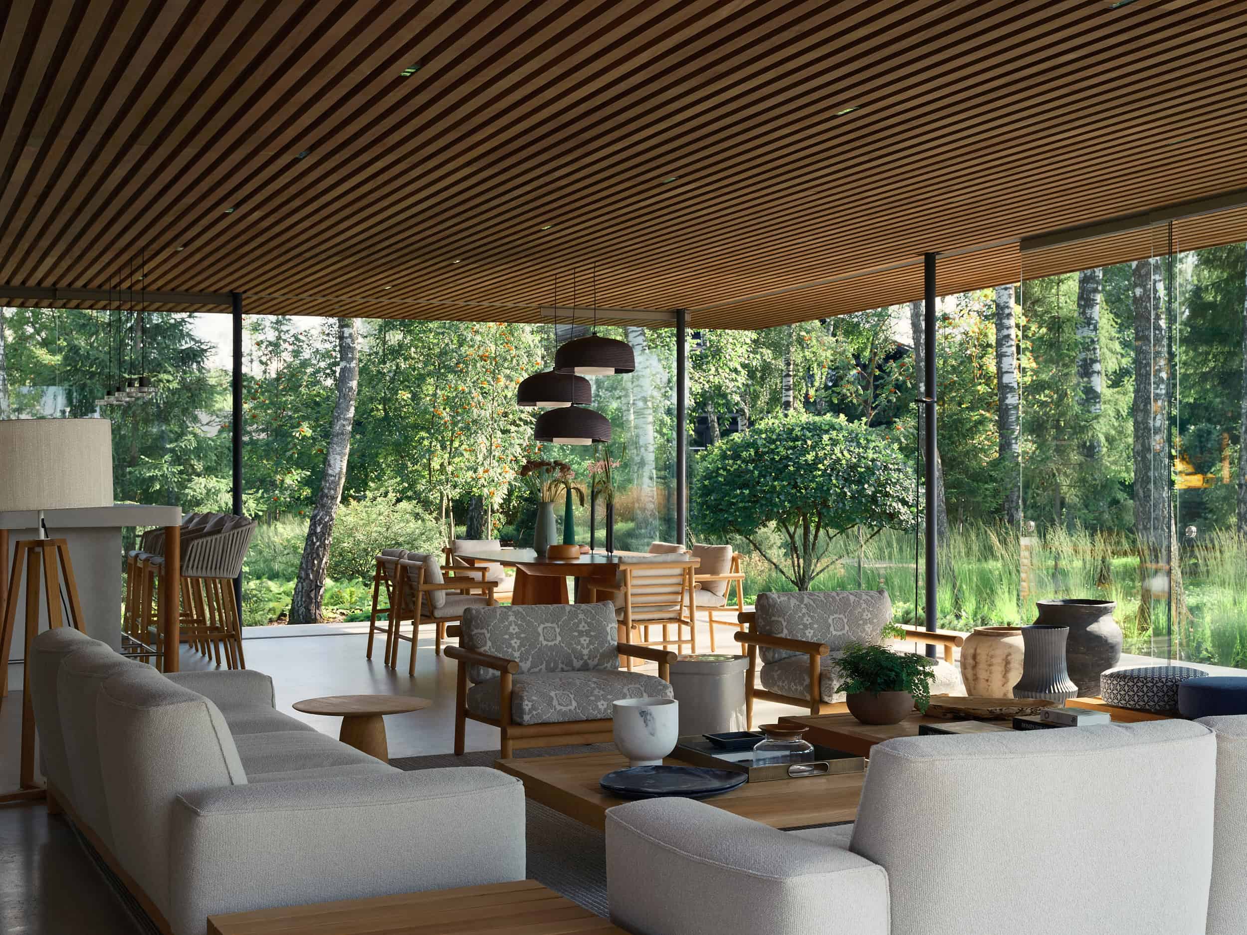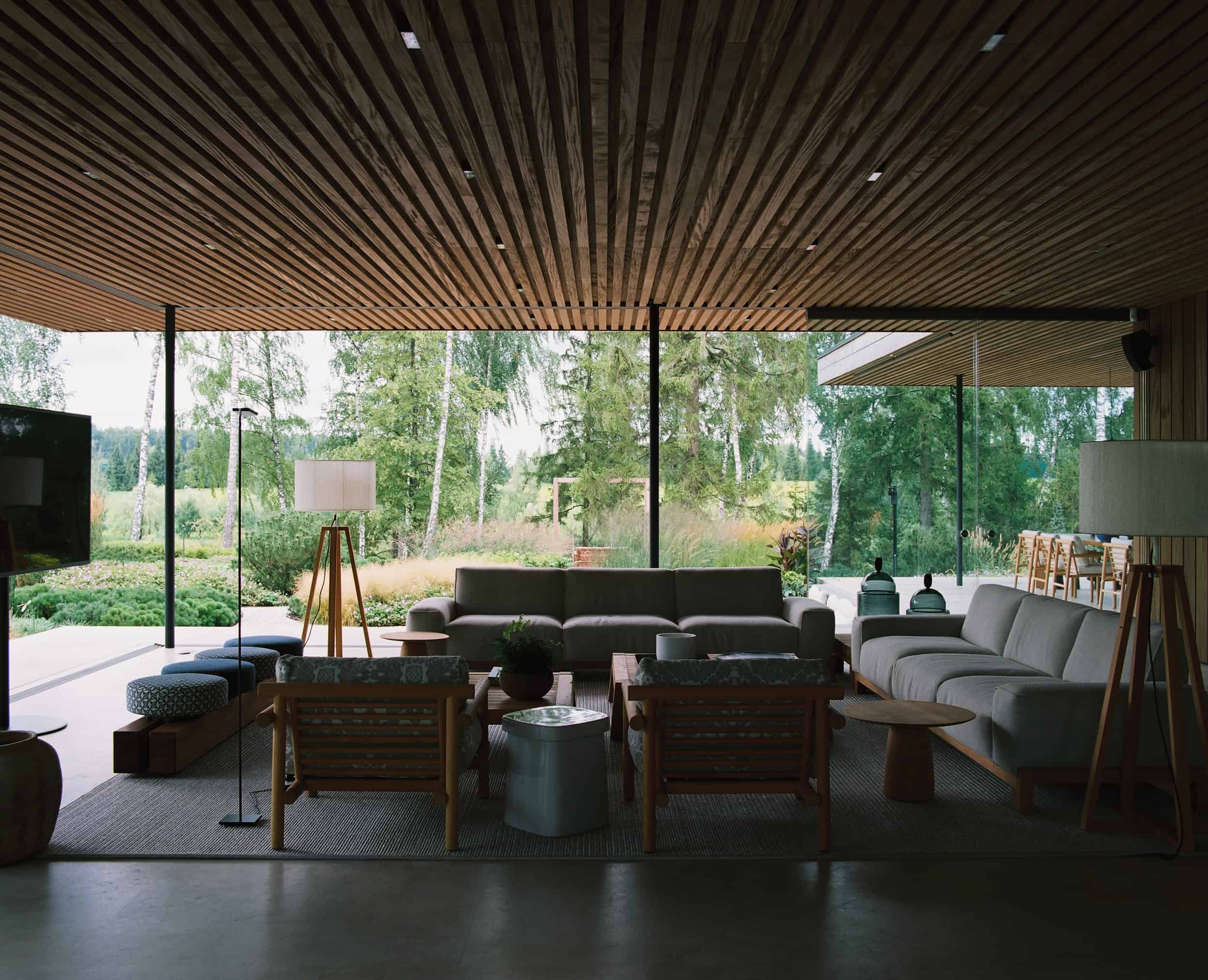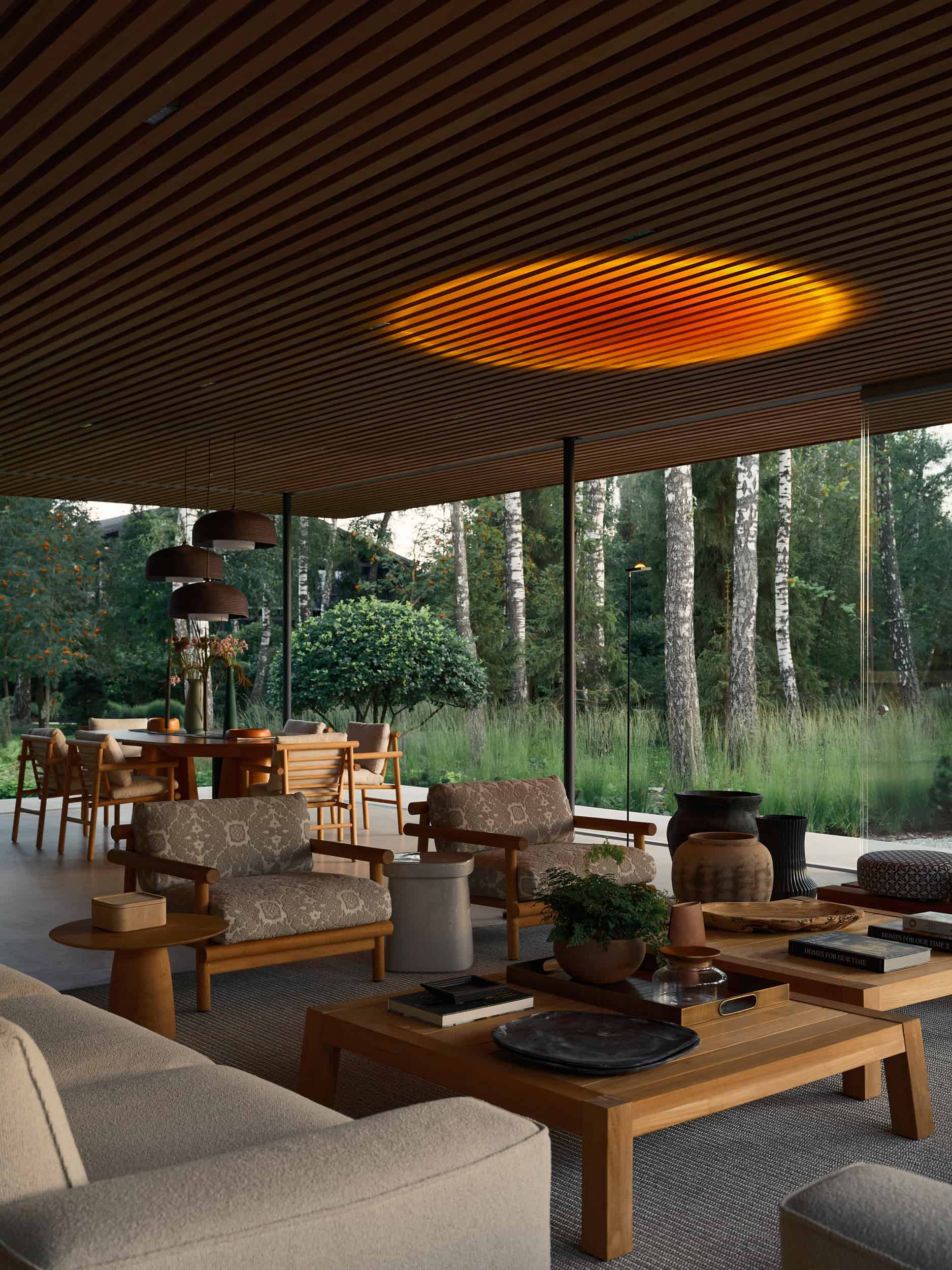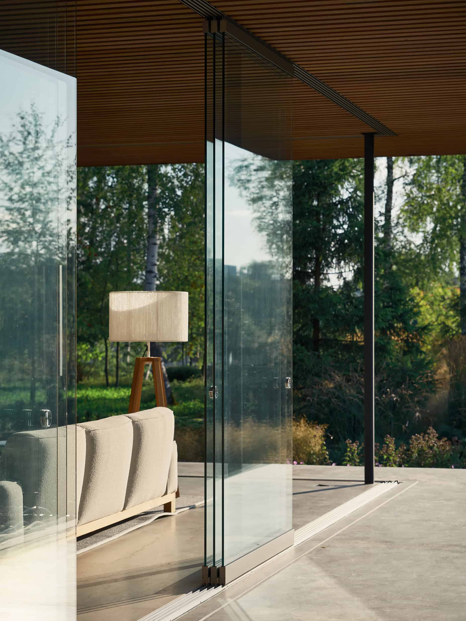 The pavilion’s standout feature is its sliding glass walls—three-meter-tall panels that can be fully opened or closed depending on the weather. These glass elements, supported by discreet metal columns, create a transparent barrier that offers uninterrupted views of the surrounding forest and a nearby river. The result is an open, light-filled space that enhances the sense of being outdoors while providing shelter and warmth.