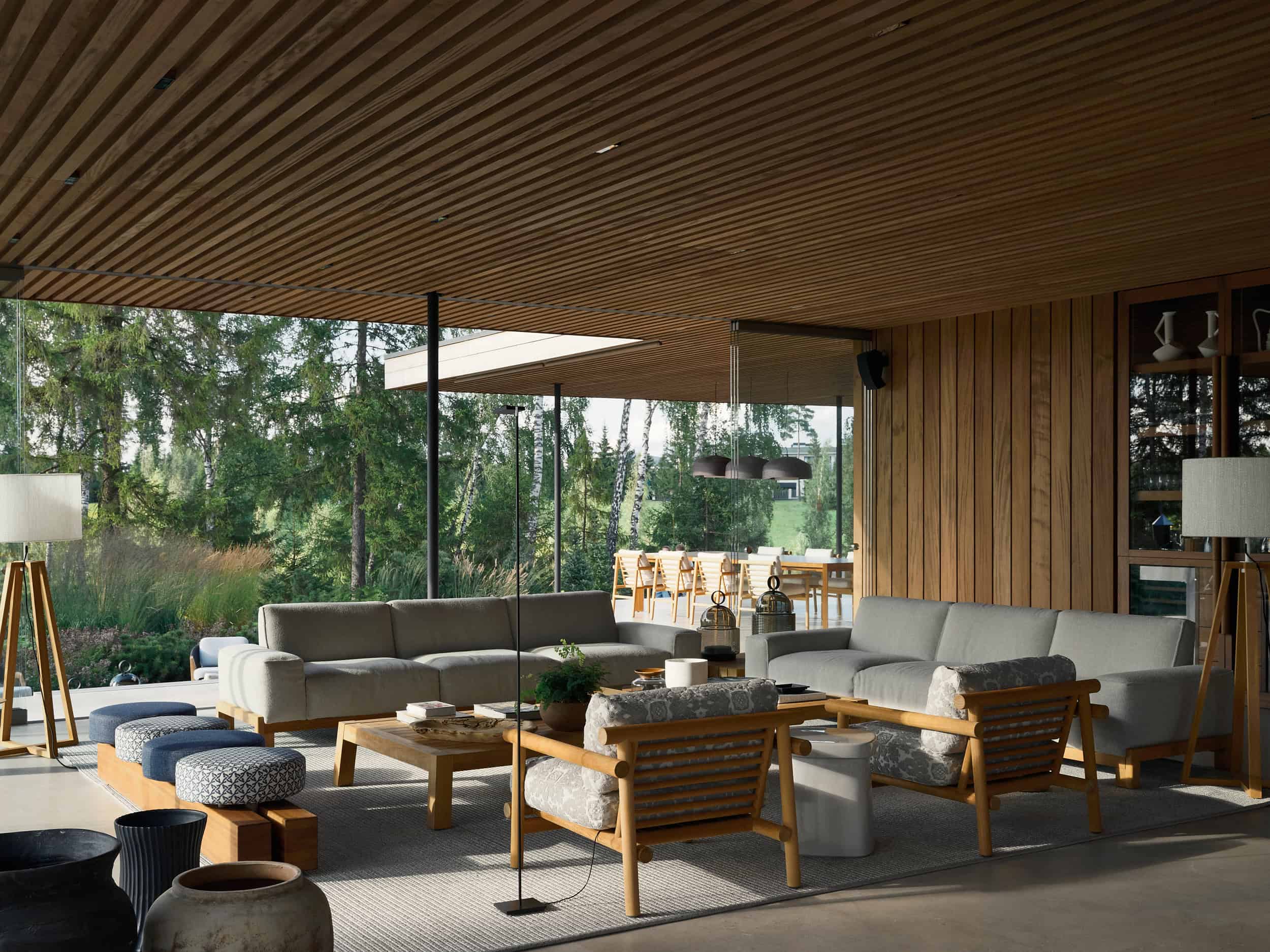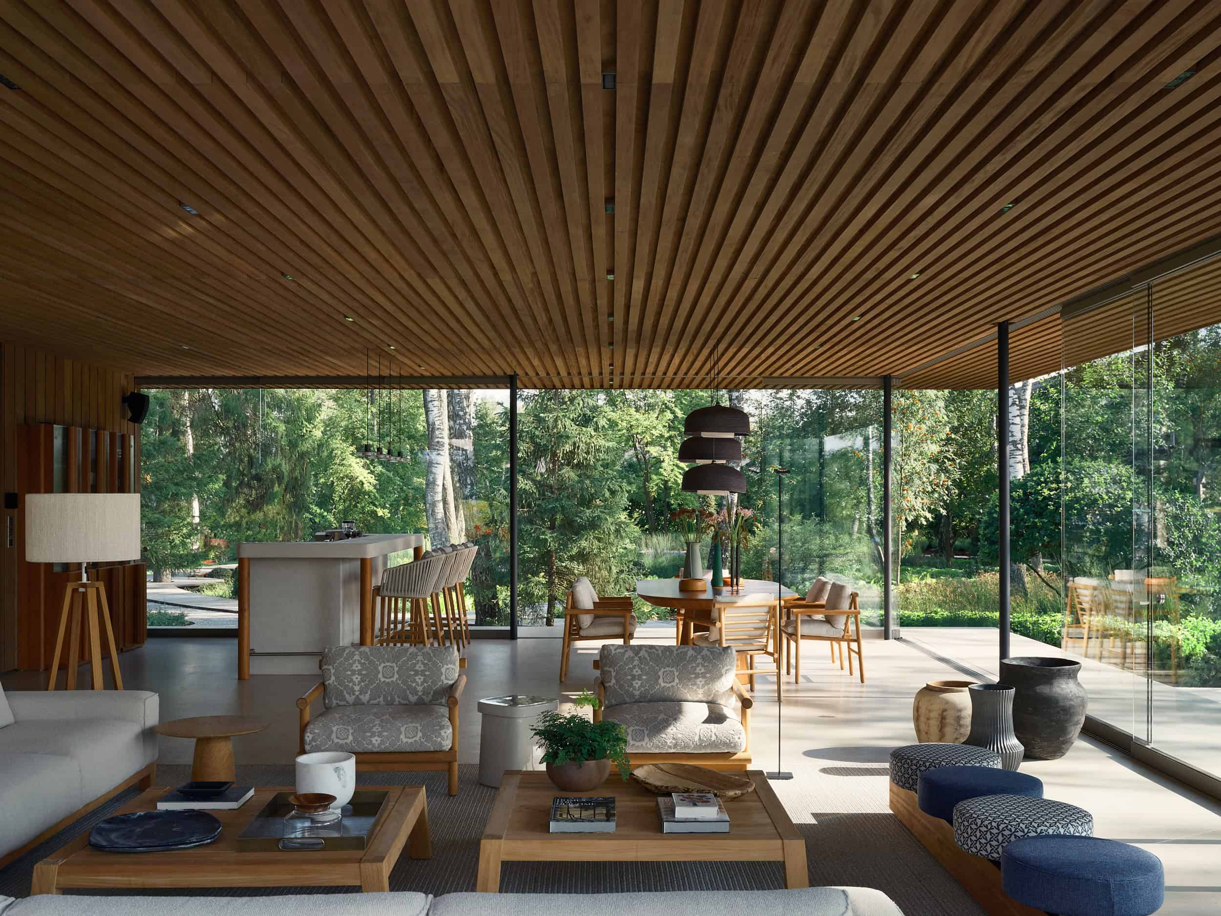 • All furniture is custom-made from natural wood, reinforcing the connection between interior and exterior spaces.
