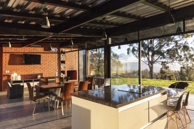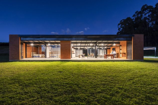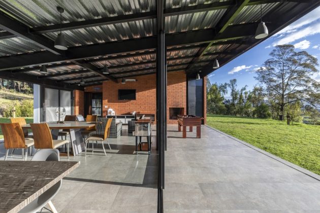 The structure is metallic, prefabricated in a workshop and assembled on site. The carpentries are also metallic, with a system of sliding and folding doors that shield the house, in order to protect it whenever uninhabited. It also performs as a large blind to shield the porch from the sun or, in certain times of the year, from the wind. In short, it is a contemporary house that uses traditional resources, optimizes materials and allows an agile, cheap and sustainable construction over time.