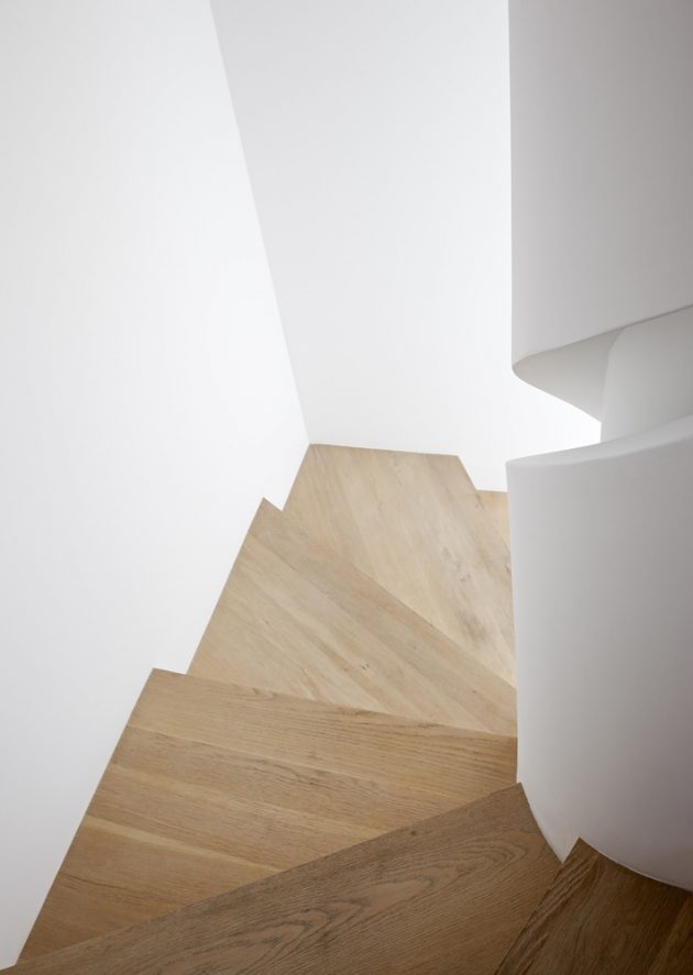 From the architects: “Driving up the hill, the angular wall with it’s overhang greets the passersby, while the straight wall welcomes visitors to enter into its main foyer. Passing through it’s threshold is to be transported from earth and into the clouds. The minimalist design is warmed up with a rich mix of materials and textures.