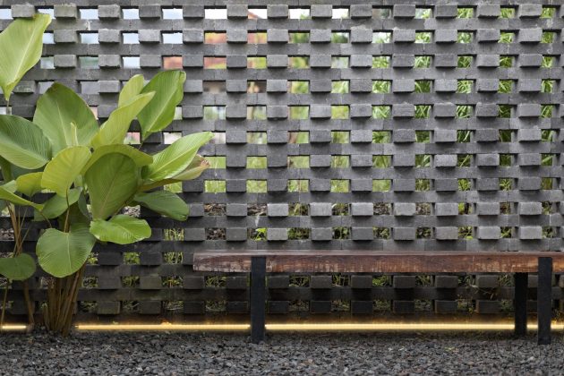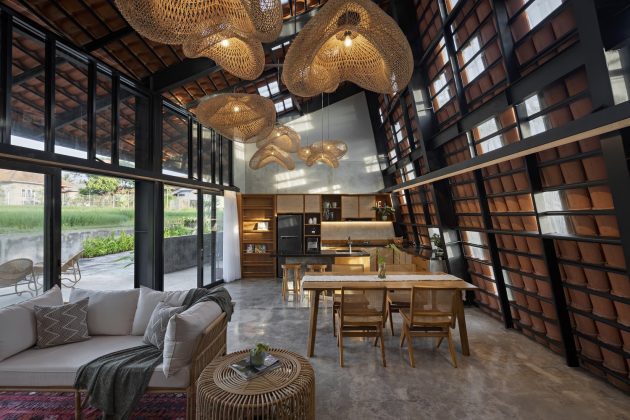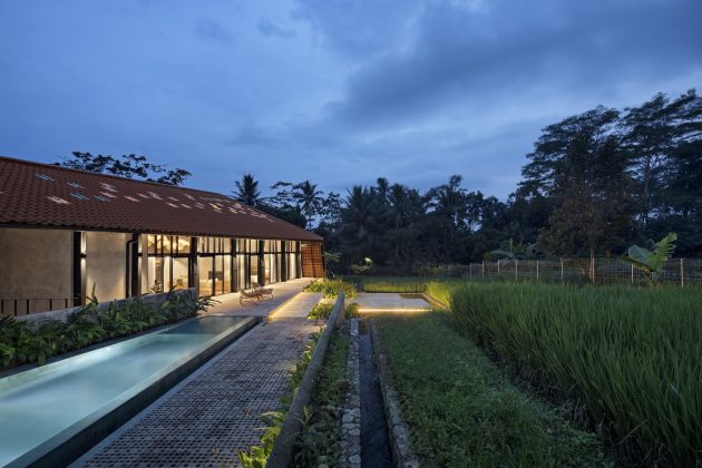 A single sweeping clay roof unifies all functions under one form, extending from the car porch and fishpond through the dining and kitchen areas to the bedrooms. The building is elevated above ground, giving the impression that it floats over the rice fields while improving ventilation and durability in the tropical climate.