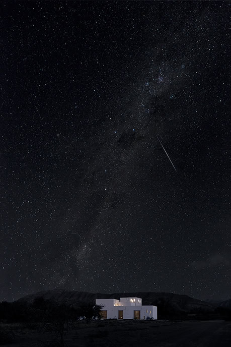 The day/night, light/dark character of the house is emphasized by the large glazed doors, which slide into rough-cast plaster walls, and small scattered openings, which allow shafts of light to penetrate into shadows, and follow the positions of stars in constellations visible from the upper roof terraces.