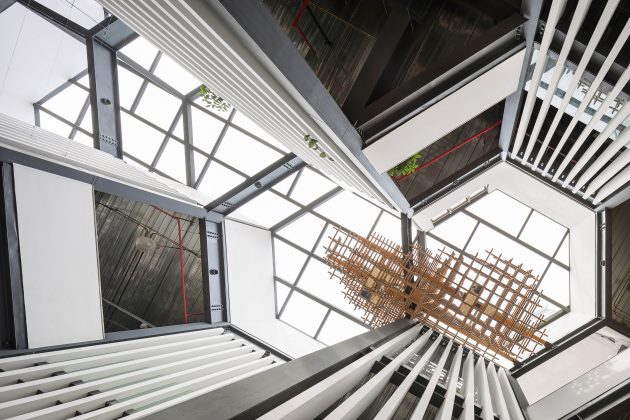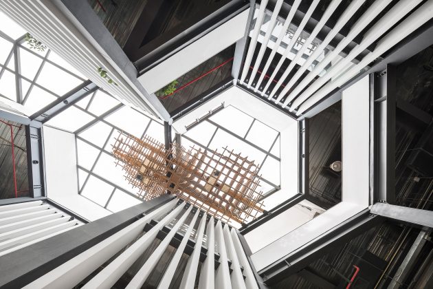 Next, the entire structural layout of each floor has been cut along the hexagon, with a glass-roof lighting atrium formed (height: nearly 25m from the very bottom up to the roof) in the middle to ingeniously break through the architecture’s interior and exterior spaces, and a steel frame has been arranged on the top to show up the hexagon, thus guaranteeing sufficient spatial capacity and also creating rich structures. In this way, both order and freedom have been gained.