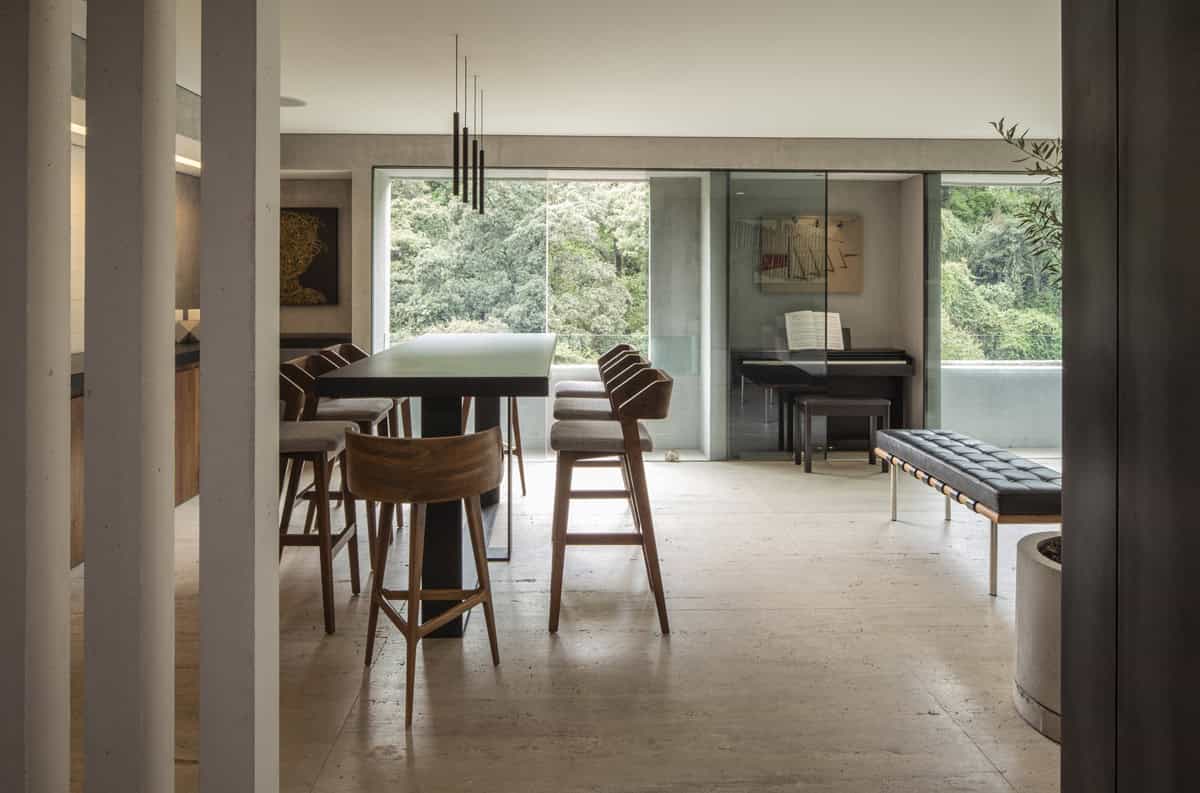 Because the owners are dedicated musicians (she plays the piano and he the saxophone), the social area -formed by the living and dining room- is divided by a piano, which is the centerpiece of the area, in its own, specially designed space, where it looks like a magnificent piece of sculpture. The living room is bounded by two walls in exposed white concrete in a wood texture finish with bows in steel gray; at the far end of the living room a long steel plate fireplace serves as the visual focal point.