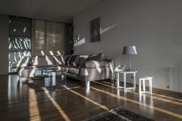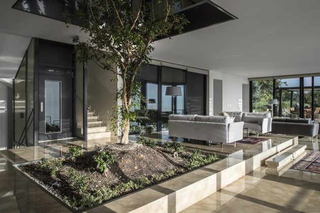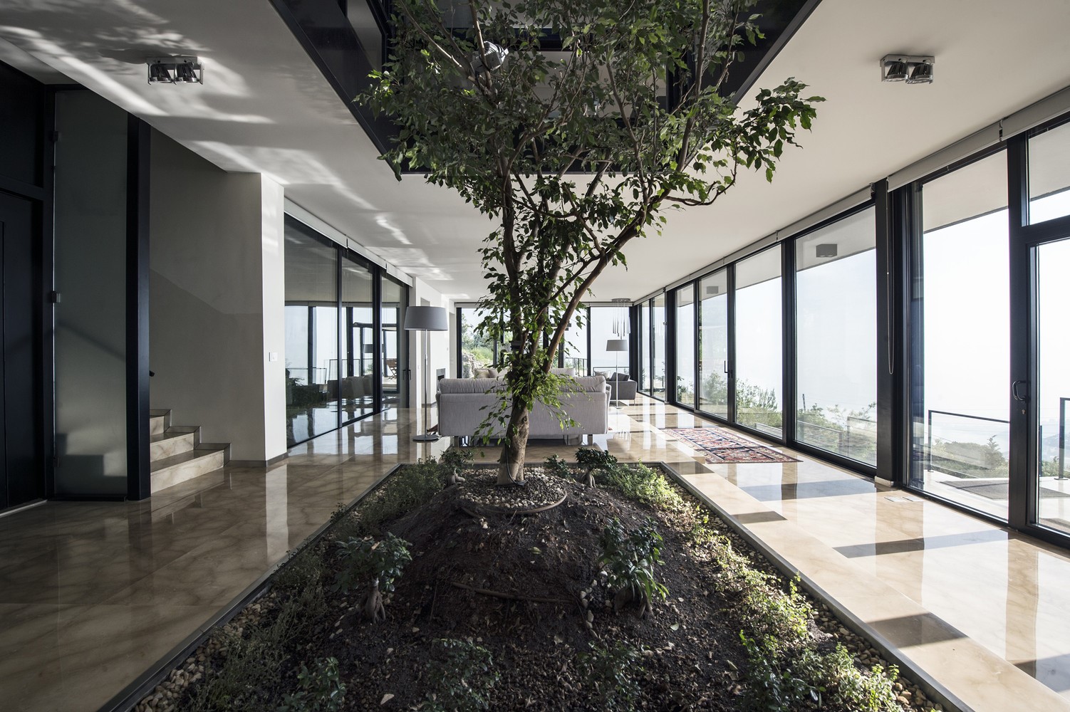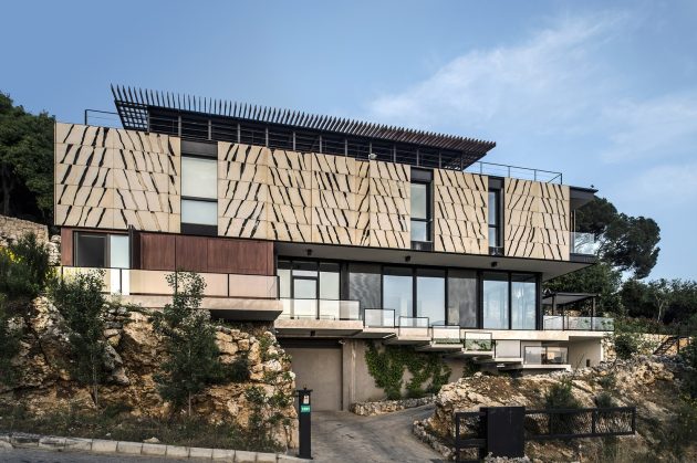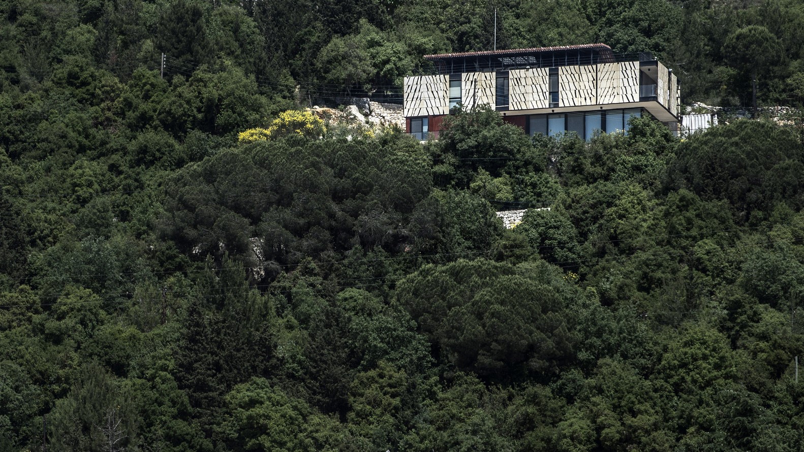 The villa’s defining feature is a horizontal volume clad in sliding stone panels. These textured surfaces recall the rocky landscape while also acting as dynamic shading devices, filtering sunlight into the private areas. The mass rests on a transparent glass box formed by terraced platforms that adapt fluidly to the site’s topography.