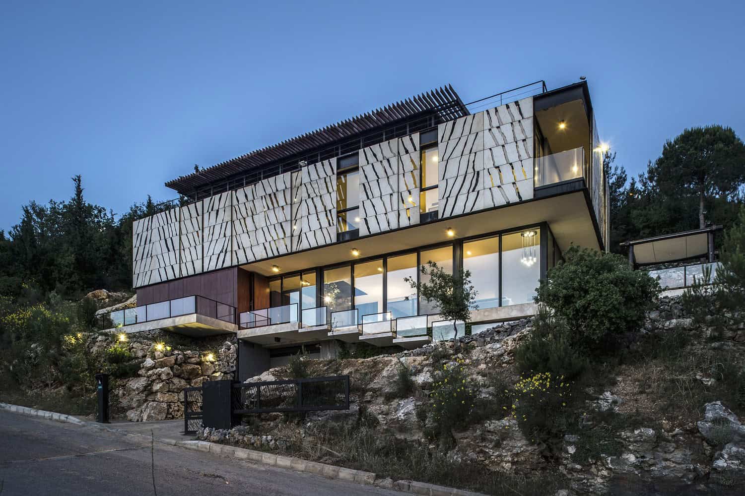 Blankpage Architects conceived the villa as a visual extension of its mountainous context. Drawing inspiration from the rugged Lebanese terrain, the home takes the form of a floating prismatic stone volume set atop a transparent base. The structure appears to rise organically from the slope, echoing the geological layers of the site and offering uninterrupted sightlines toward the sea.