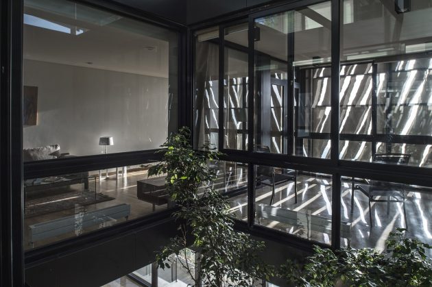 At the rooftop, a light steel pergola topped with terra-cotta louvers shelters a painting studio, surrounded by a spacious roof terrace. This element pays subtle homage to the region’s architectural vernacular, particularly the red-tiled roofs of traditional Lebanese homes.