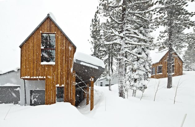 Vernacular mining and stamp mill buildings in the Tahoe area inspired the design of this home. Long before Tahoe was a ski resort, it was a gold rush destination. Tall stamp mills were used to pulverize hard rock into fine silt from which the gold could be removed. All movement of material within the mill was achieved by gravity hence the structures are characteristically elongated vertically.
