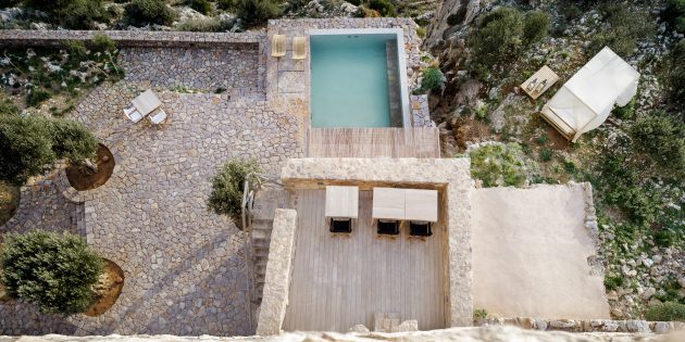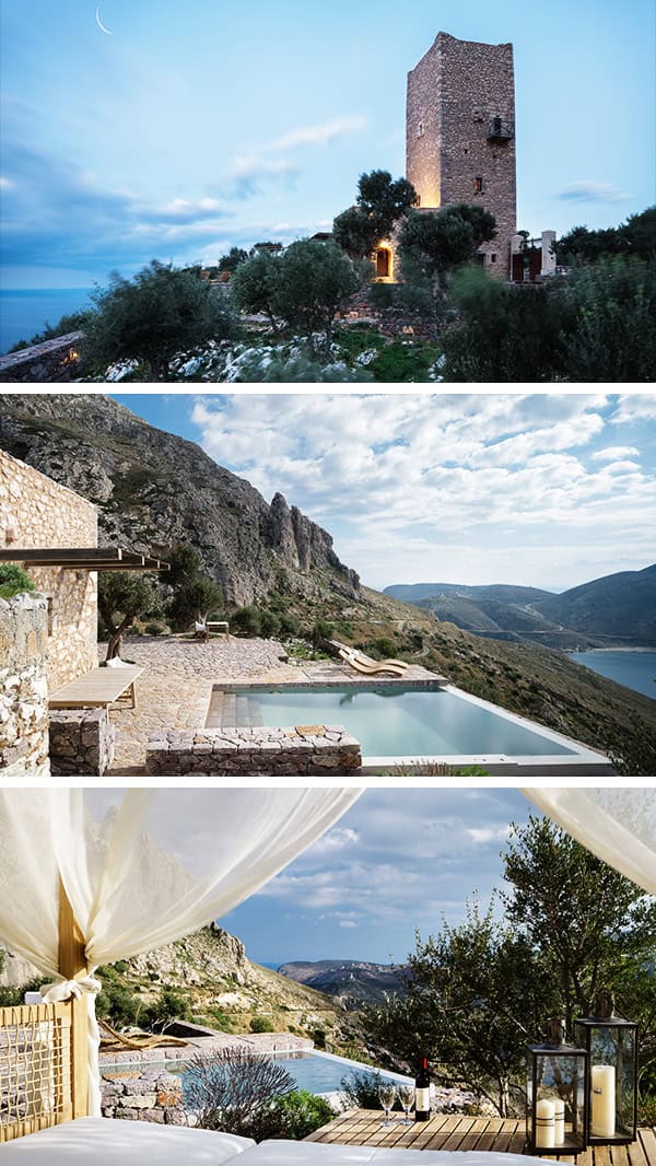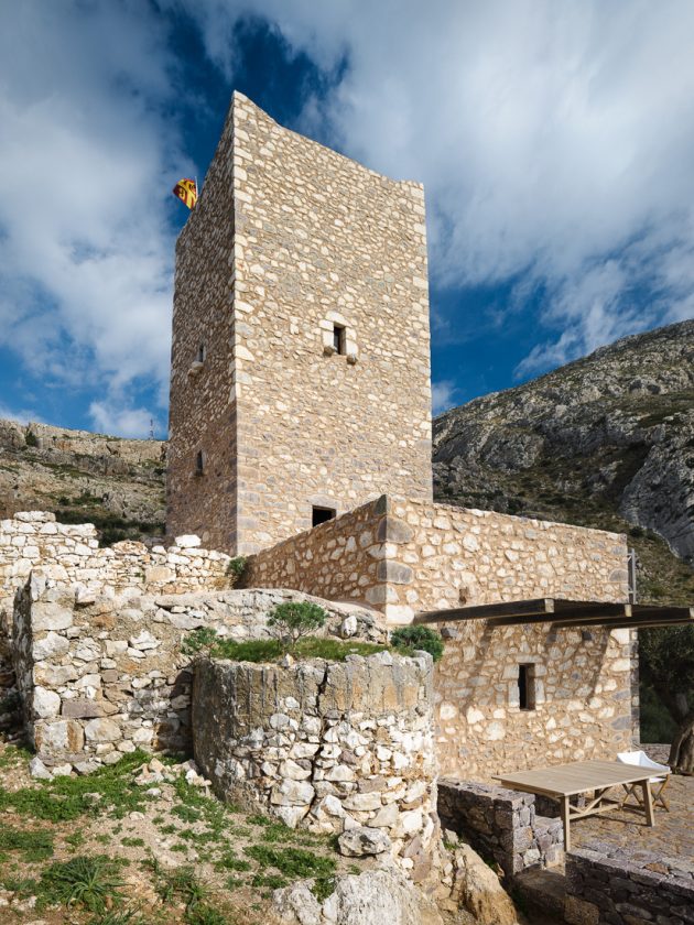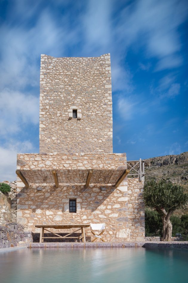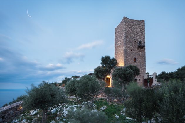 The Tainaron Blue Retreat is a 19th century fortified tower that has recently been converted into a hotel by the Greek architects Kostas Zouvelos and Kassiani Theodorakakou. It is located in Lakonia, Greece on a parcel of land that offers stunning overlooking views of the coast and the sea.